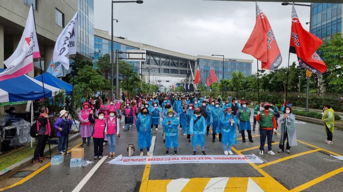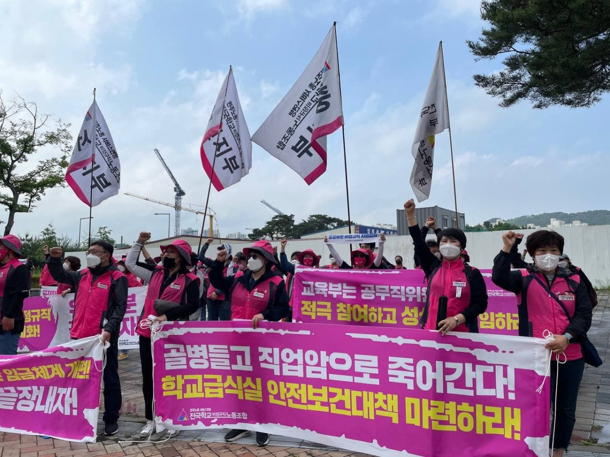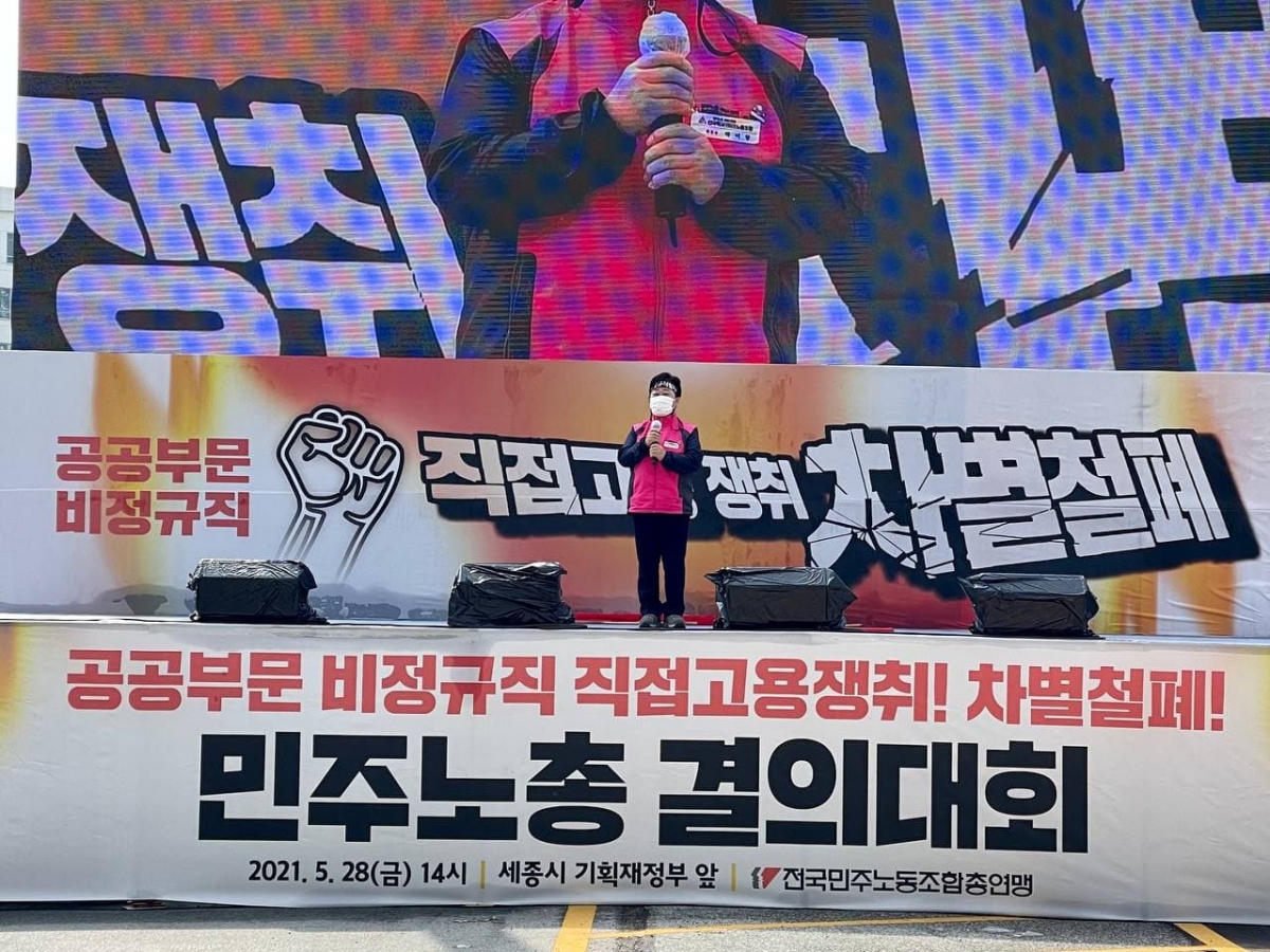 박미향 서비스연맹 전국학교비정규직노조 위원장은 투쟁사를 통해 “1만개가 넘는 학교 안에는 17만명의 비정규직 노동자들이 존재하고 있다. 미래세대를 책임지고자 건강하고 안전한 학교 생활을 위해 우리들은 급식노동자 돌봄노동자 교실에서 행정실에서 운동장에서 함께하고 있다. 그런 학교비정규직 노동자들은 그림자처럼 유령처럼 살아가고 있다”며 “코로나19 시기 차별과 냉대의 설움을 온전히 겪고 있다. 110만 민주노총 총파업과 함께 학교부터 바꿔낼 것을 결심했다. 우리 사회 뿌리깊게 내제된 불평등 구조를 바꿔내자”고 힘주어 말했다.