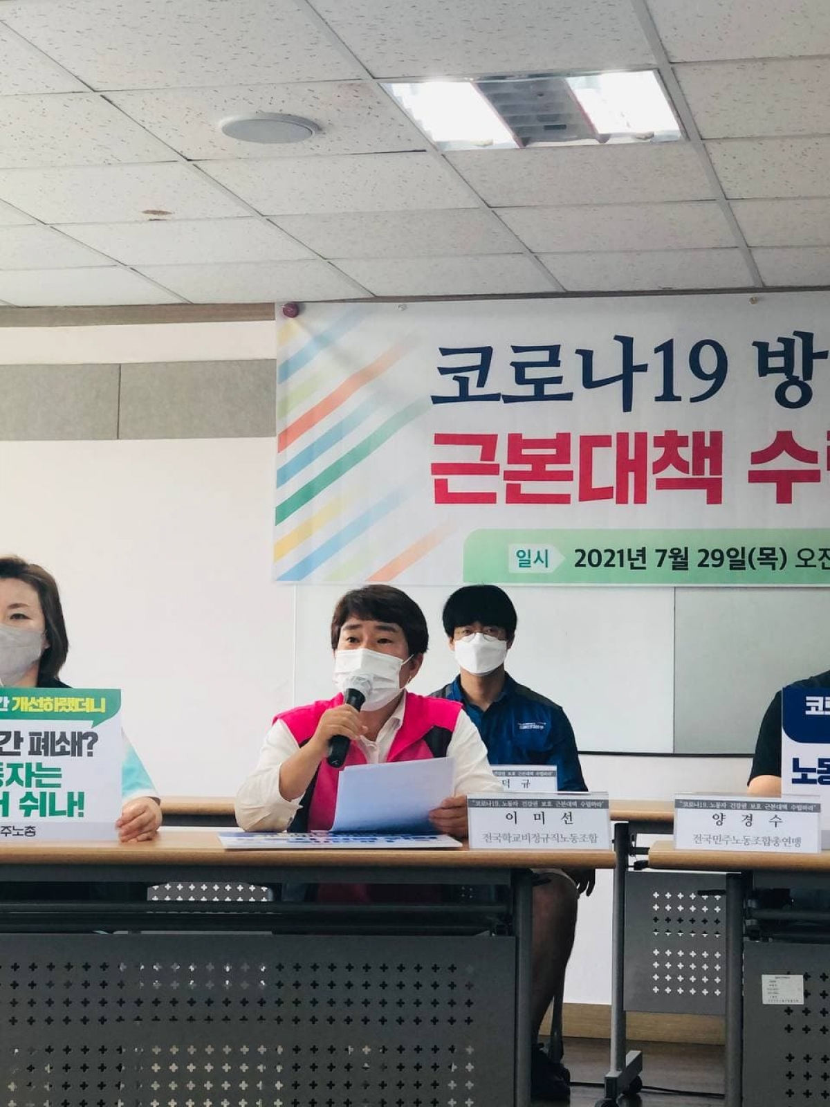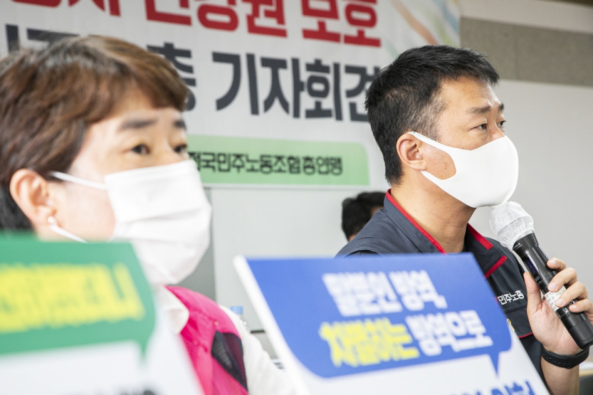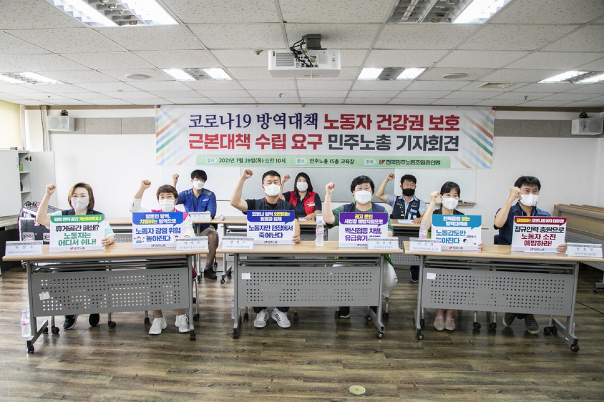 민주노총은 오늘(7.29) 코로나 방역일선에 있는 노동자들의 건강권 보호를 위한 근본대책 수립을 요구하며 기자회견을 개최했다.