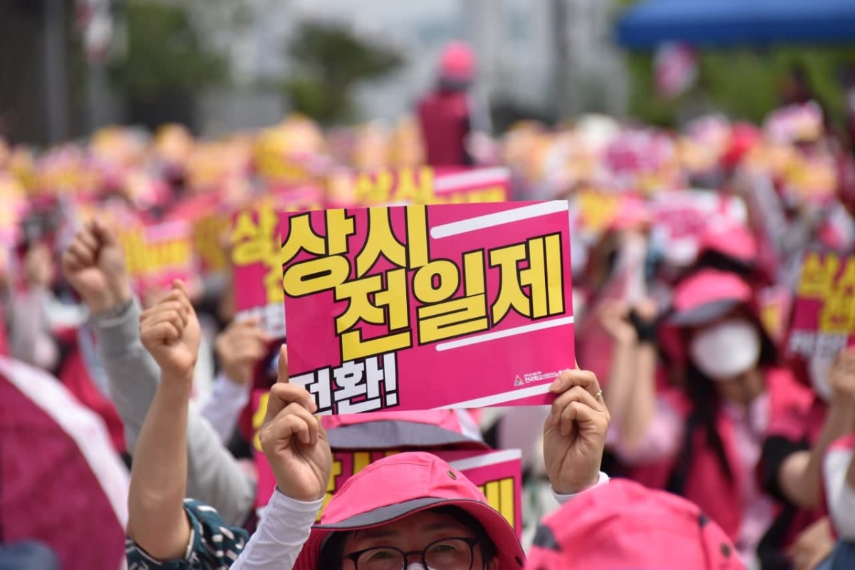 ▲지난 6월19일 세종시 교육부 앞에서 열린 '전국초등돌봄전담사 총궐기대회'에서 상시전일제 전환을 요구하였다.
