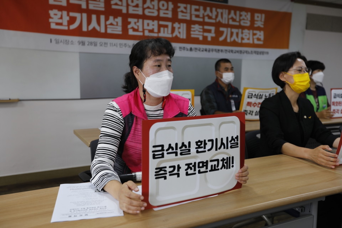 기자회견 참가자들은 “우리 급식 노동자들은 더 이상 죽을 수 없다. 정부는 급식실 노동자에 대해 직업성암 전수조사를 실시하고, 급식실 환기시설부터 전면교체 해야한다”며 “그러나 정부당국인 교육부와 노동부는 환기시설을 포함한 작업환경개선, 급식실 노동자 특수건강진단 요구에 제대로 된 대책을 내놓지 못하고 있다”고 했다.