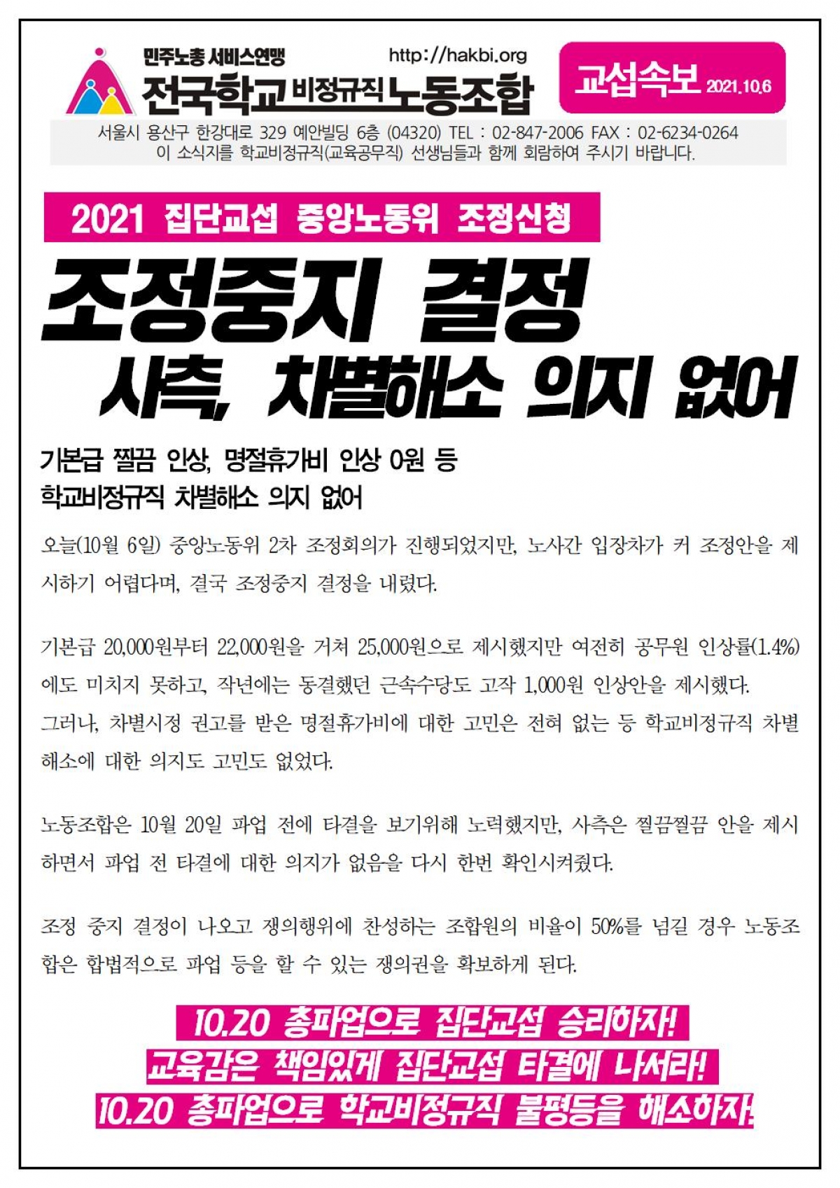 중앙노동위, 조정중지 결정... 차별해소 의지 없어