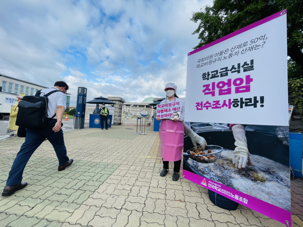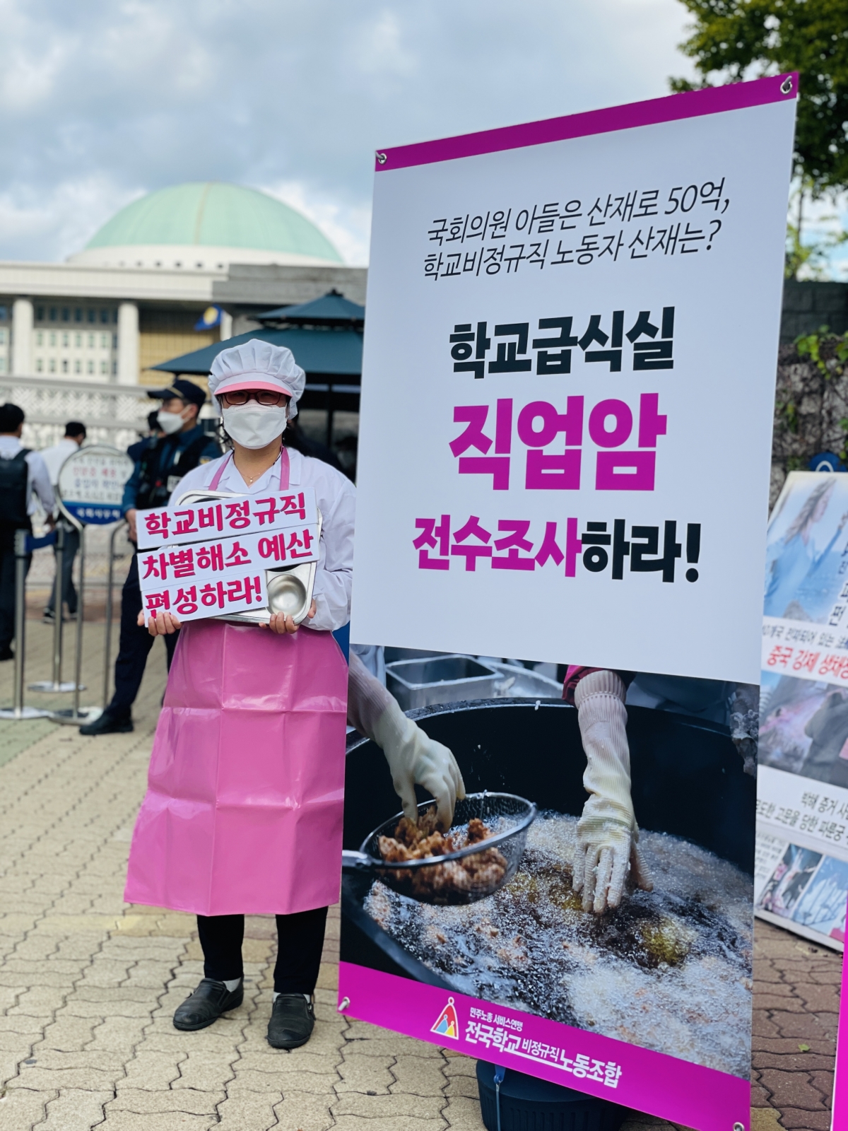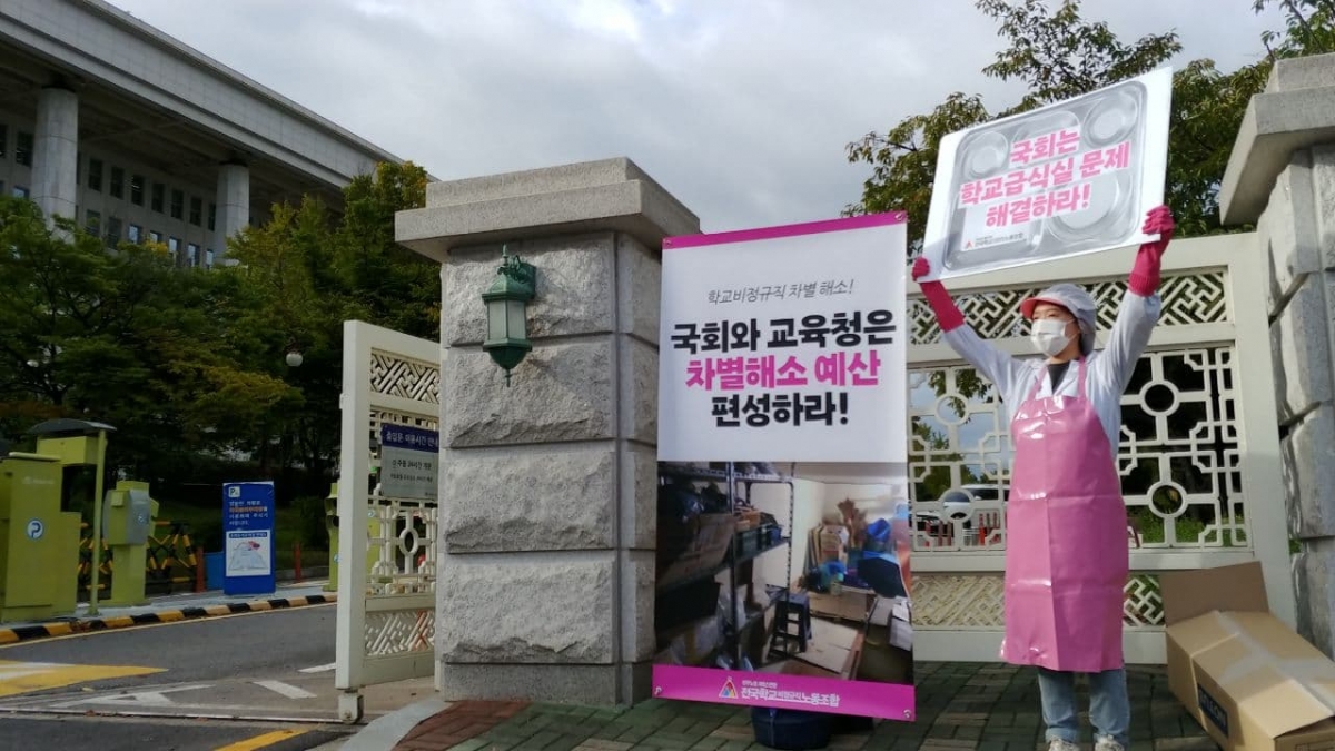 오늘(12일)은 국회 교육위원회 국정감사로부산, 대구, 광주, 울산, 제주, 전북, 전남, 경북, 경남교육청(총 9개 기관) 교육감이 국회에 출석하는 날이다. 이에 전국학교비정규직노동조합은 오늘 아침 국회 4곳의 출입문에서 학교비정규직 임금 차별 해소는 물론, 학교급식실 노동환경 개선, 학교돌봄, 교육복지 예산 증액 편성으로 교육격차 해소와 불평등 해소에 대한 노동조합의 사회적 요구를 1인 시위를 통해 알렸다.