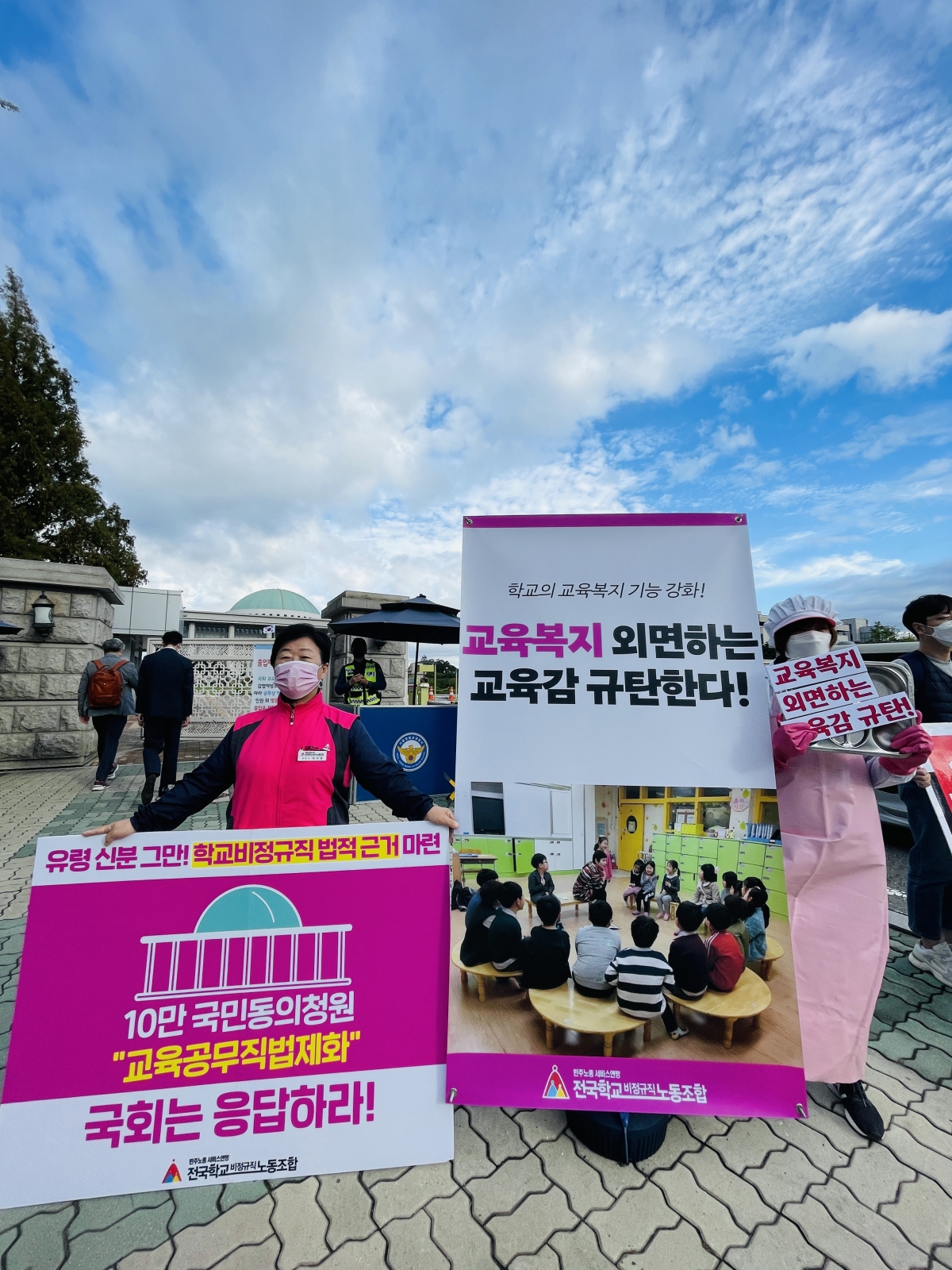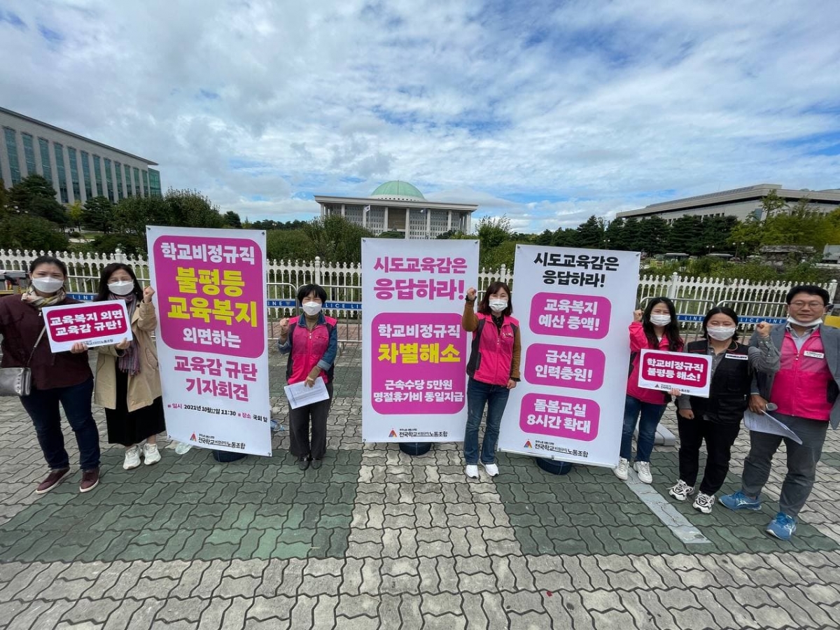 이 날 기자회견은 급식대란, 돌봄대란, 교육복지 대란이 예상되는 학교비정규직의 총파업을 앞두고  교육관료들 뒤에서 몸을 사리는 교육감들이 직접 교섭에 나서고, 노동조합의 요구에 응답해야 함을 교육감과 국회에 기자회견으로 알려내는 자리였다.