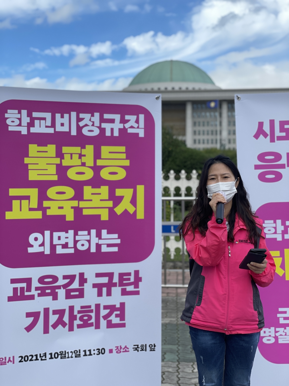 서울지부 정은영 교무행정지원사는 방학중 비근무 학교비정규직 생계대책 마련과 상시 전환 촉구했다. '교육부 소속 교육공무직 중 53%가 방학 중 임금이 없는 방중비근무자"라며 '1년은 12달인데도 9.5개월만 일하는 비정상적인 노동 형태는 과감히 없애"고, "국회 교육부 교육청은 학교의 구성원인 방학 중 비근무자들의 상시전환을 위해" 적극적으로 나설 것을 요구했다.