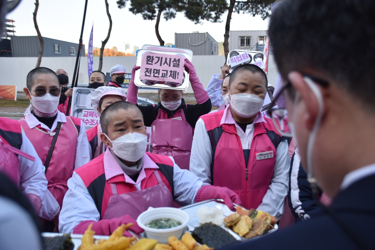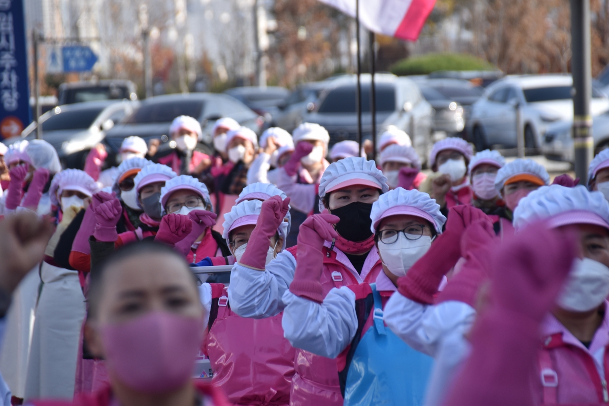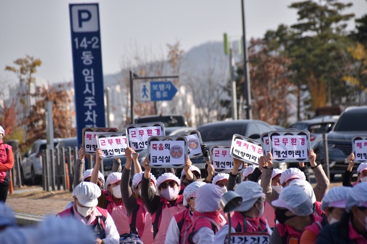 대회에 참여한 조합원들은 급식복과 학교급식 식판을 들고 노동강도 완화, 배치기준 하향, 환기시설 전면 교체, 암환자 전수조사, 임시건강검진 등 안전하고 건강하게 일하게 해달라고 요구했다.