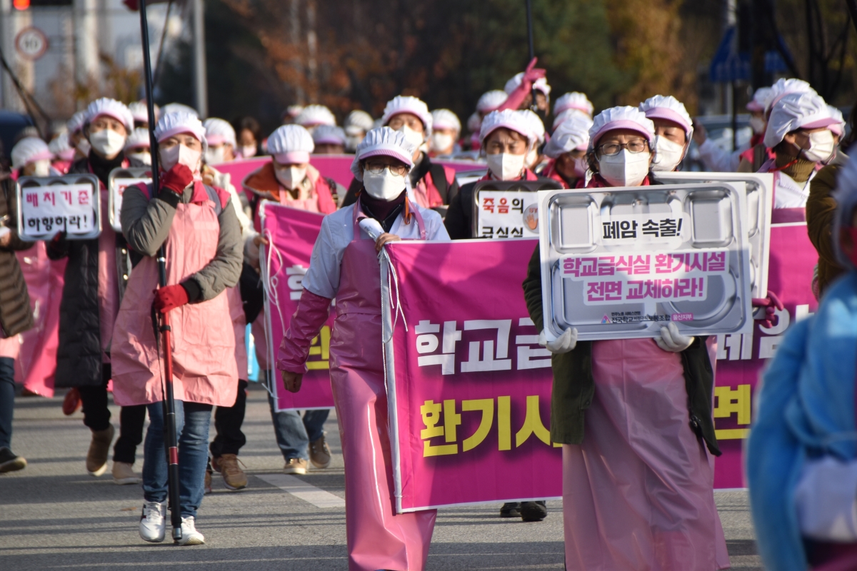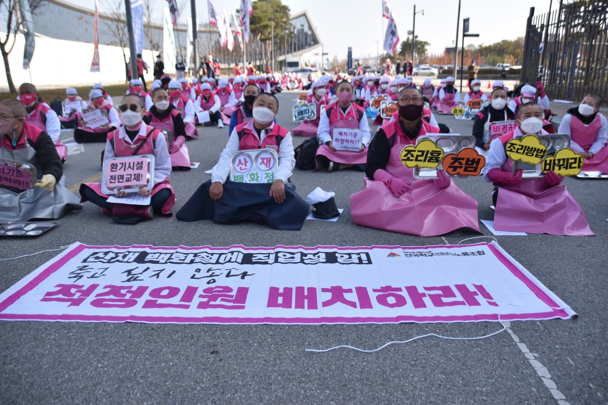 근골질환과 사고성 재해는 끊이지 않았고 이제는 직업성 질환(폐암)까지 급식노동자를 위협하고 있다. 노동조합은 학교급식실에서 죽지 않고 일할 권리, 안전하고 건강하게 일할 권리를 위해 교육당국에 지속적으로 노동환경 개선과 대책 마련을 요구하고 있으나 교육당국은 근본적인 문제를 해결하기 위한 노력을 하지 않고 있다.