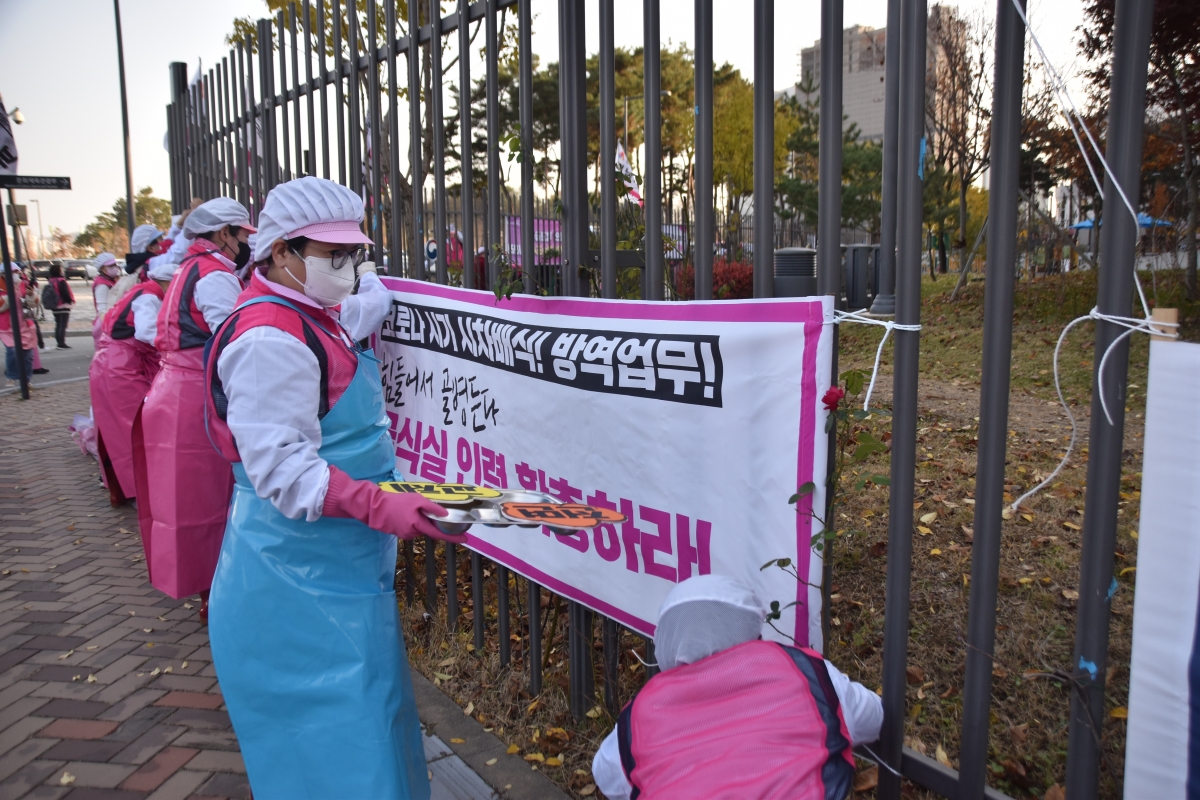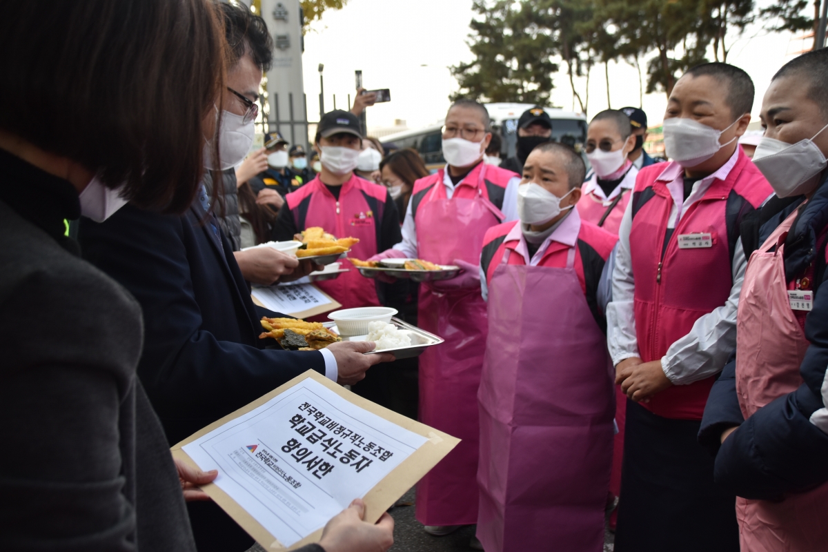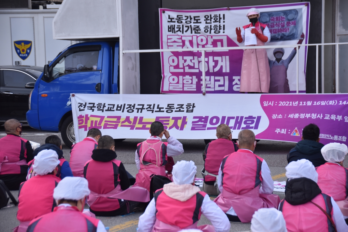 전국학교비정규직노동조합은 16일 세종시 교육부 앞에서 ‘학교급식노동자 결의대회’를 열었다.