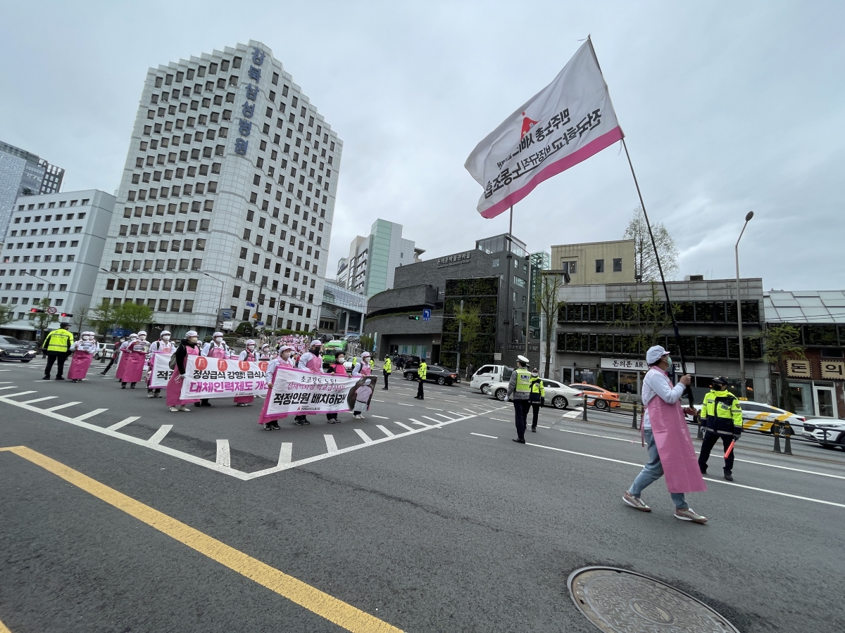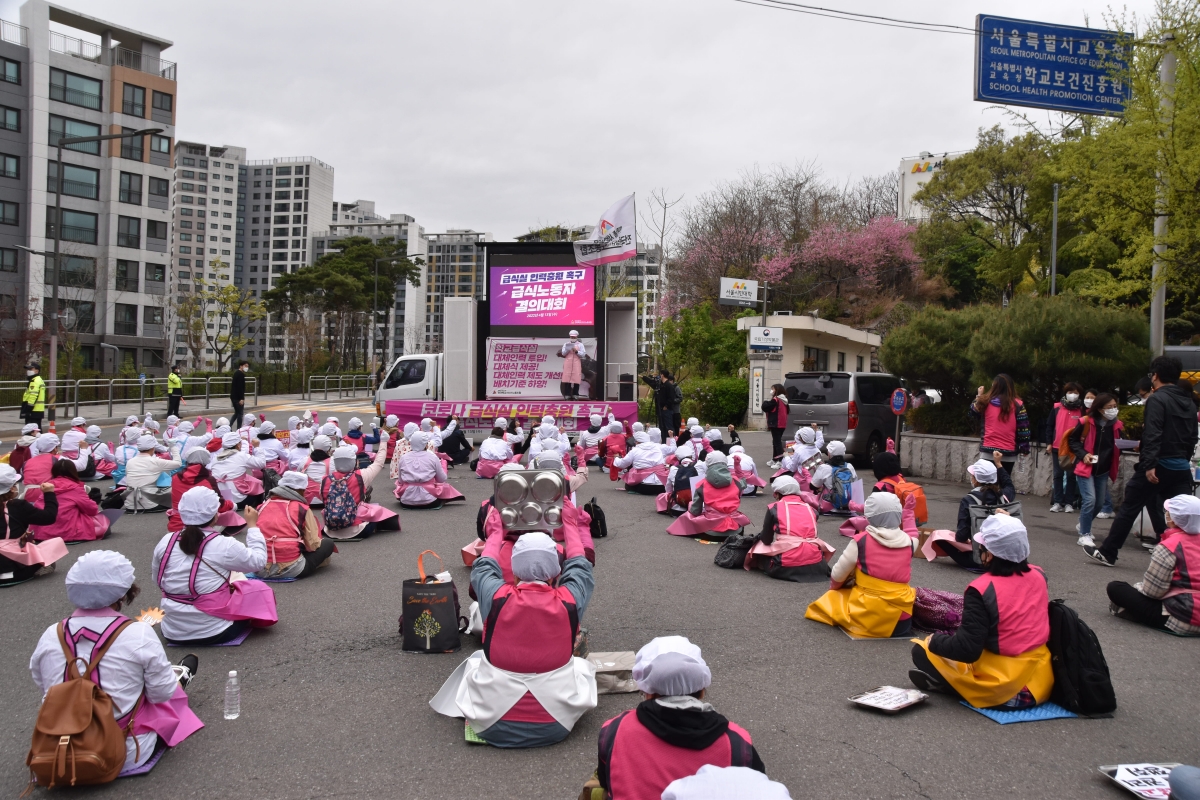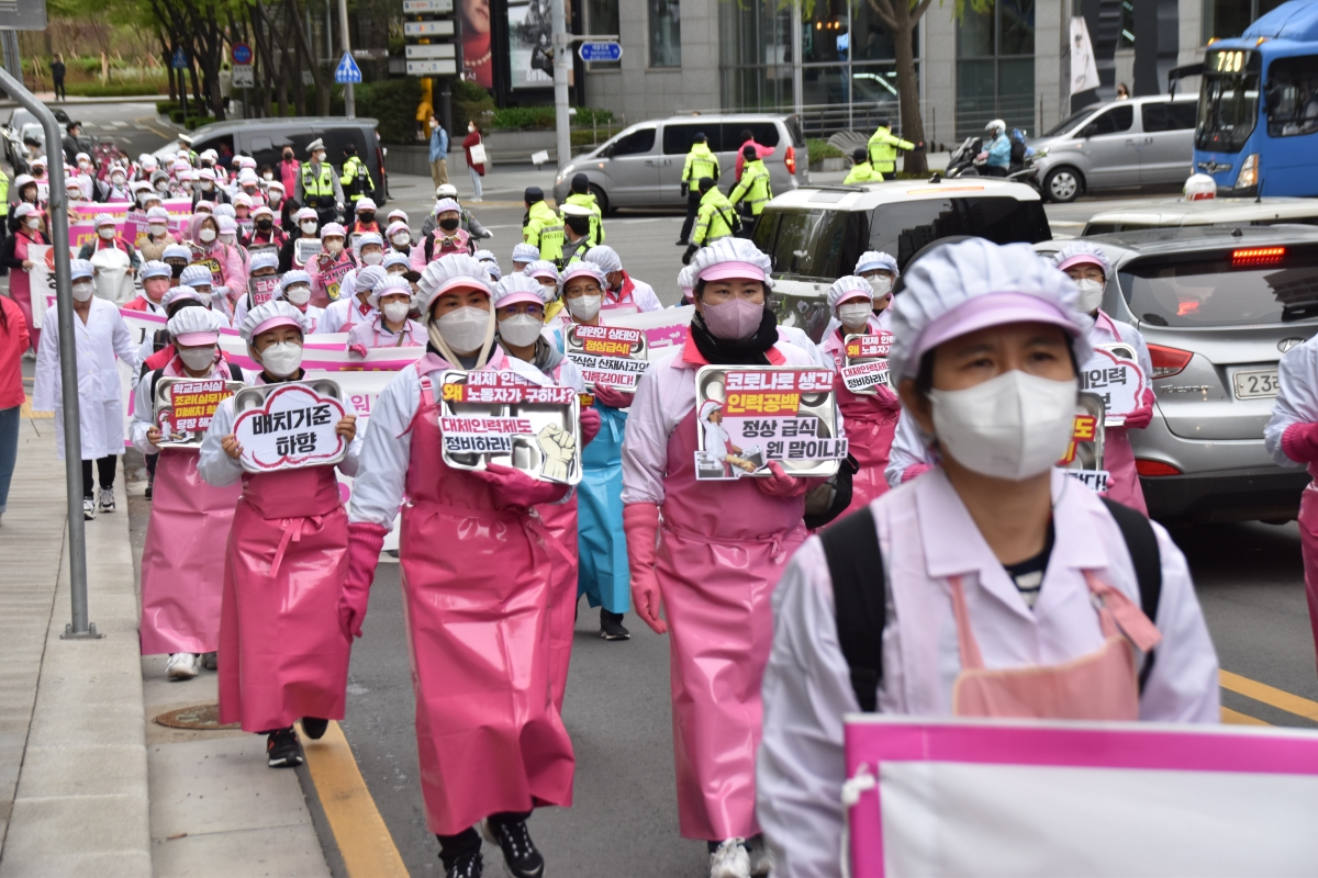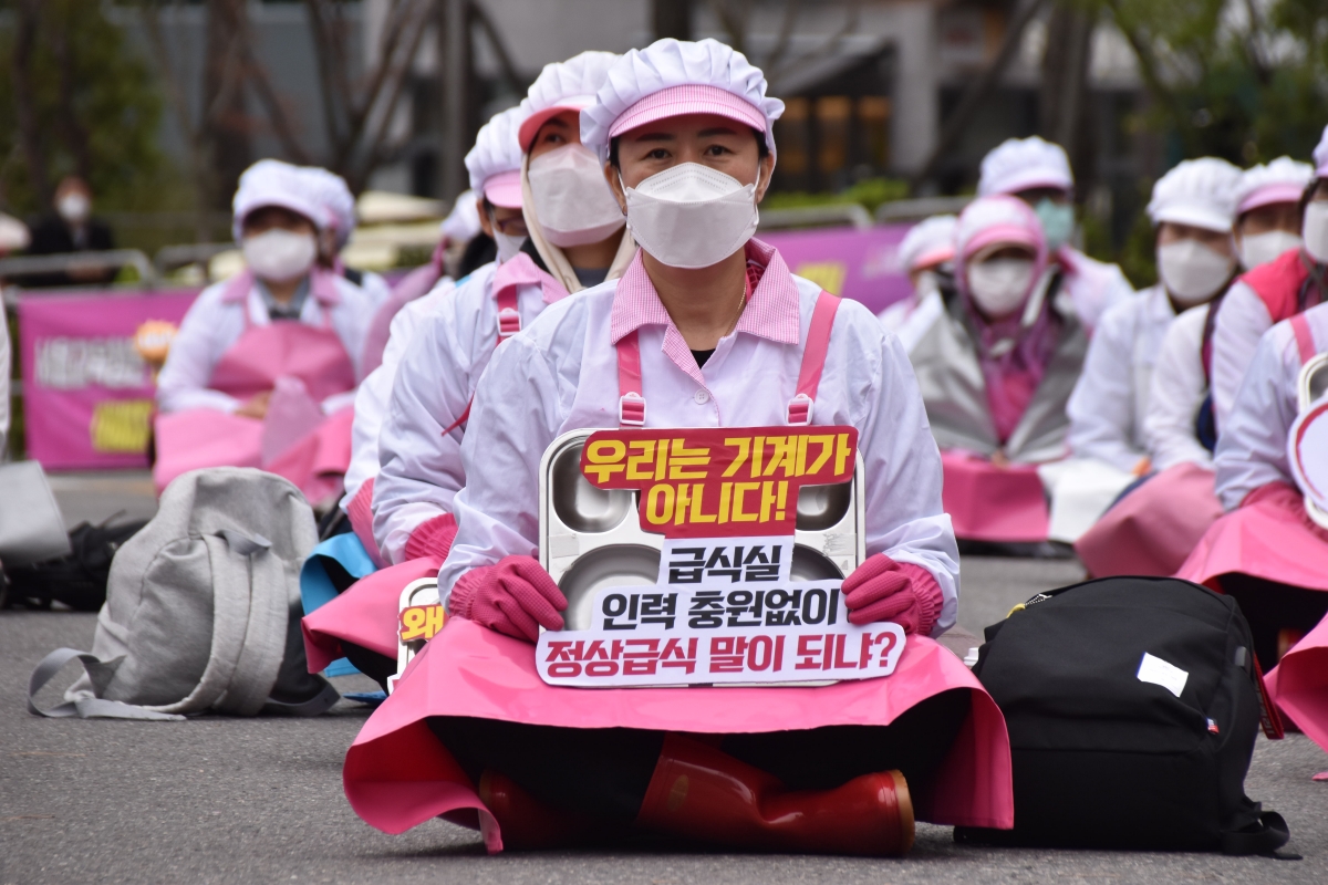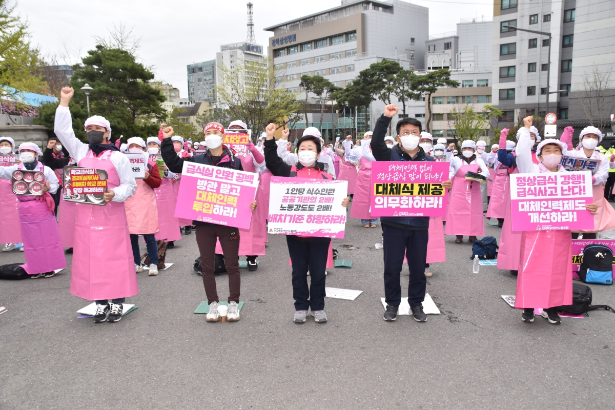 4월임에도 차가운 바람이 파고드는 다소 쌀쌀한 날씨였지만, 모든 참가자들은 급식복을 입고 식판, 국자를 두드리며 힘있게 코로나로 부족한 인력에 대해 대책을 마련하라고 요구했다.