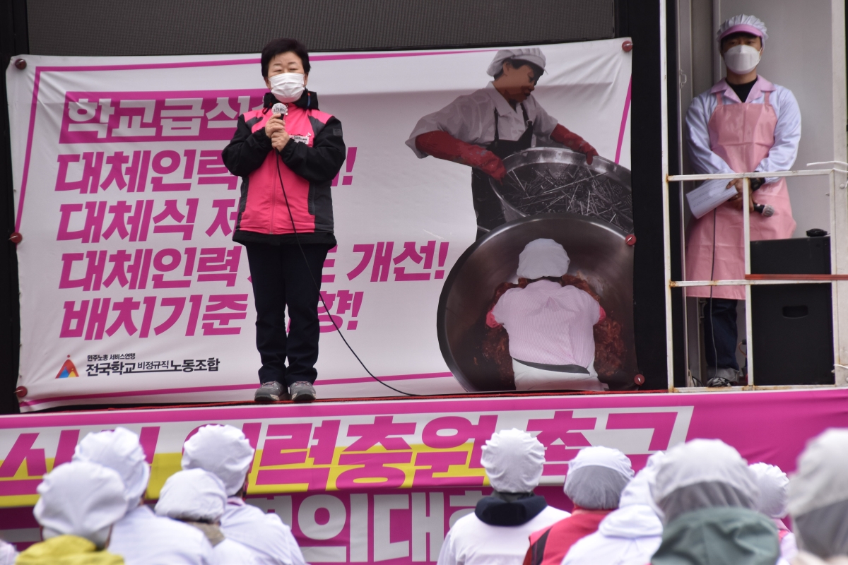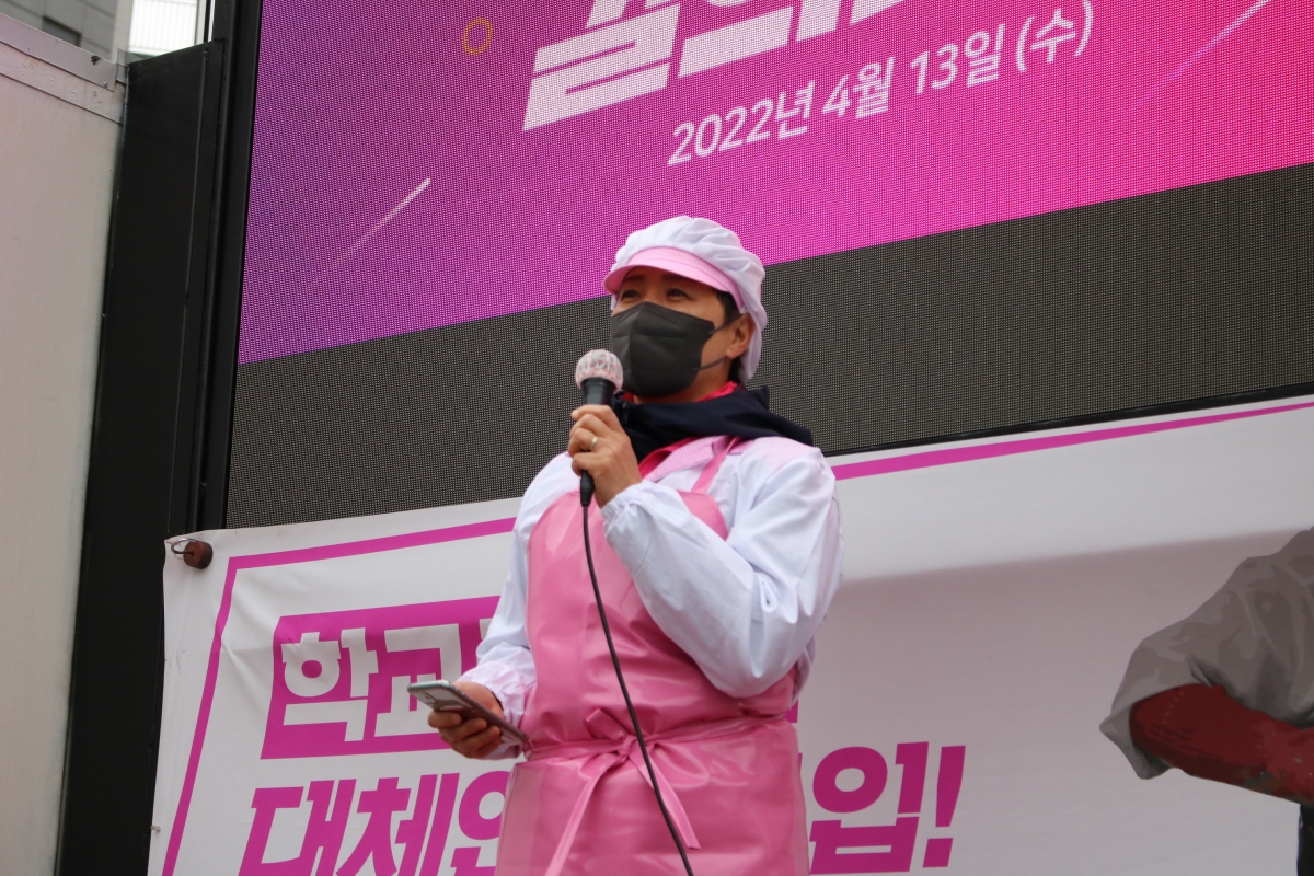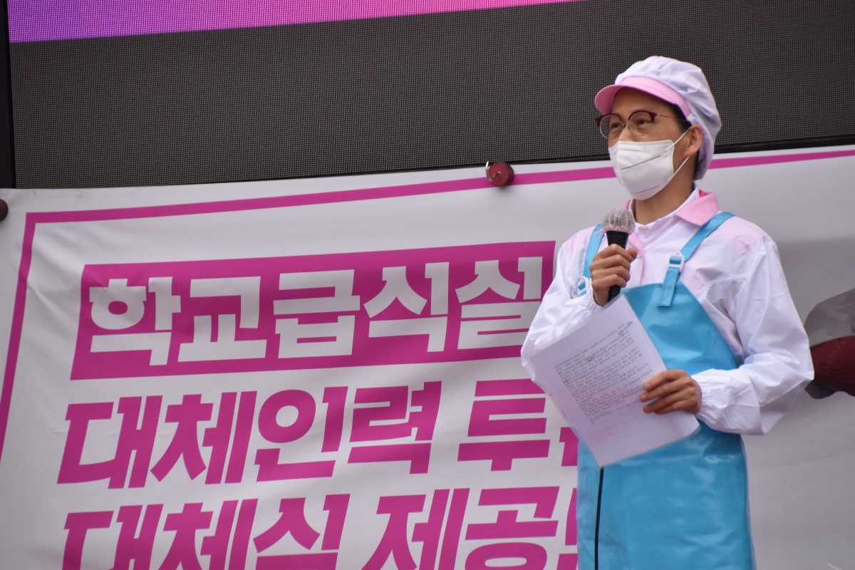 "교육부도 교육청도 학교급식실의 현실을 제대로 알고 있는지 의문"이라며 "교사들은 코로나 공백으로 지하철에 광고까지 하는데 학교비정규직은 직접 대체인력을 구하고 있다"면서 "이것도 비정규직 차별"이라고 말했다. 또한 "학비노조는 안전한 급식실, 건강한 급식실을 만들기 위해 끝까지 투쟁할 것"이라고 다짐했다.