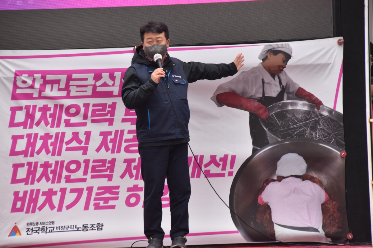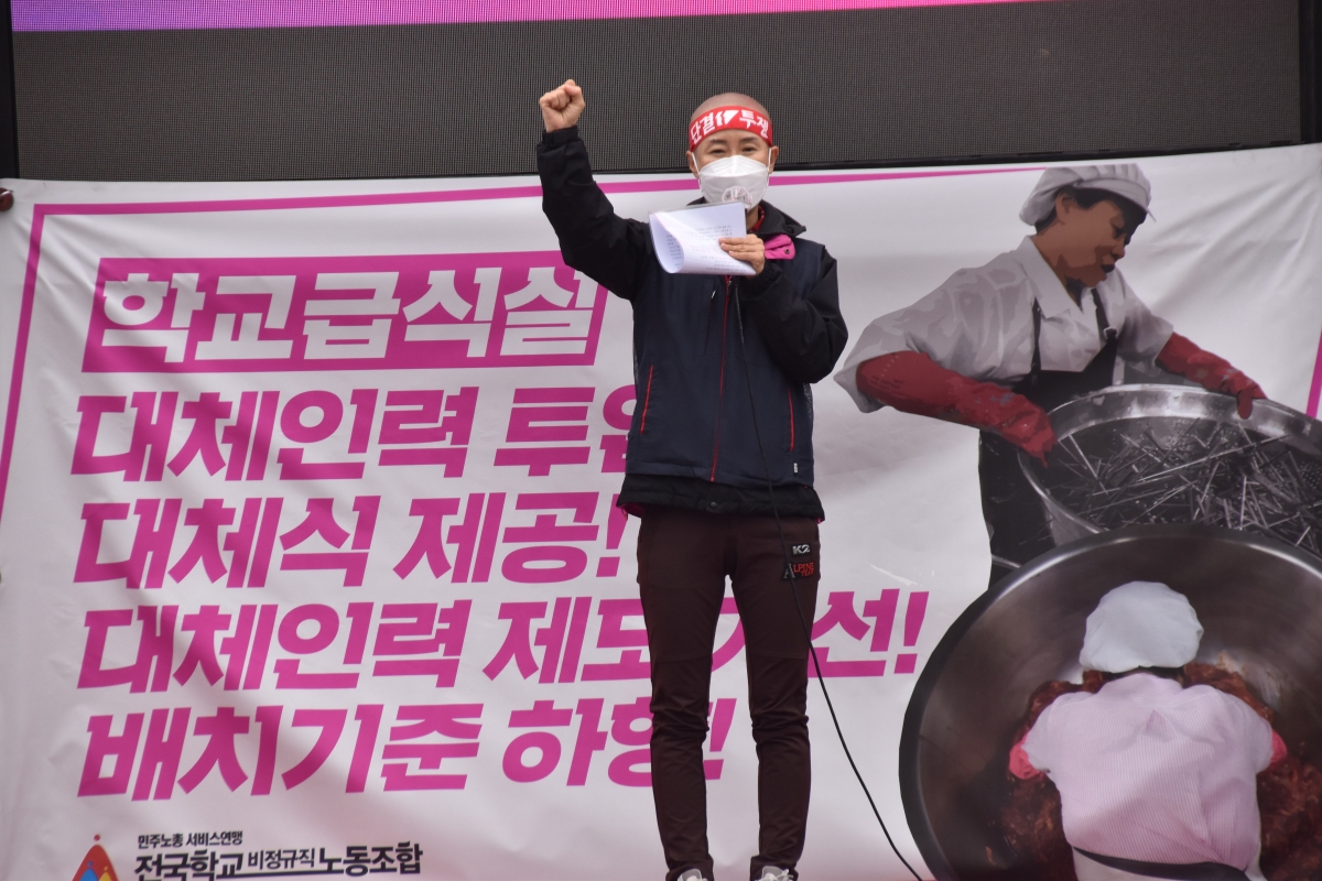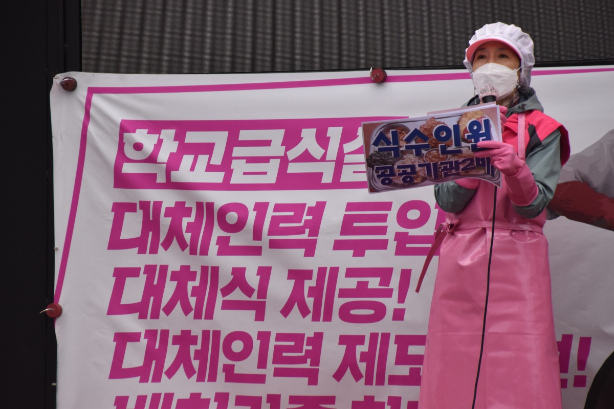 규탄발언에 나선 김수정 학비노조 노동안전위원장은 "대체인력제도는 어제오늘 문제가 아니다"며 ”학교현장에서는 어떻게든 정상급식이 나가도록 강요하고 있다"고 말했다.