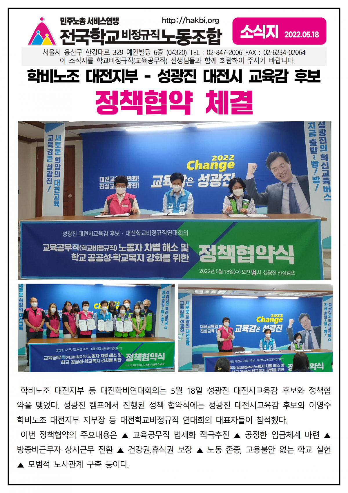 대전지부, 성광진 대전시교육감 후보와 정책협약 맺어