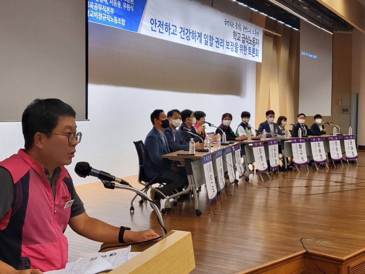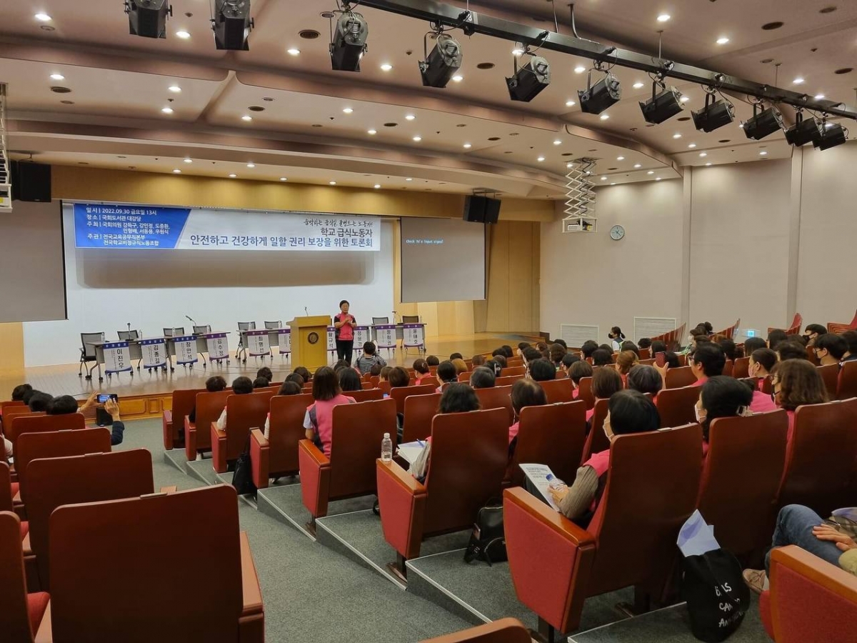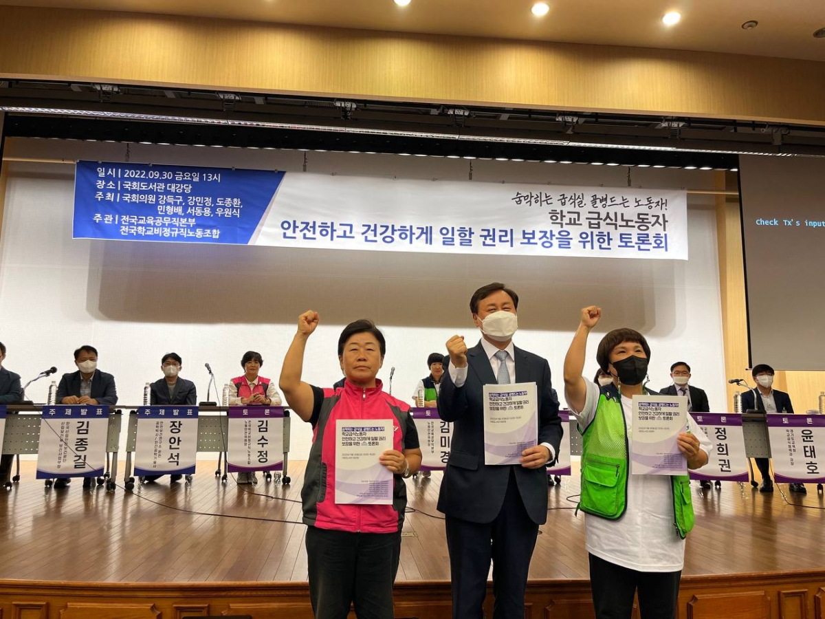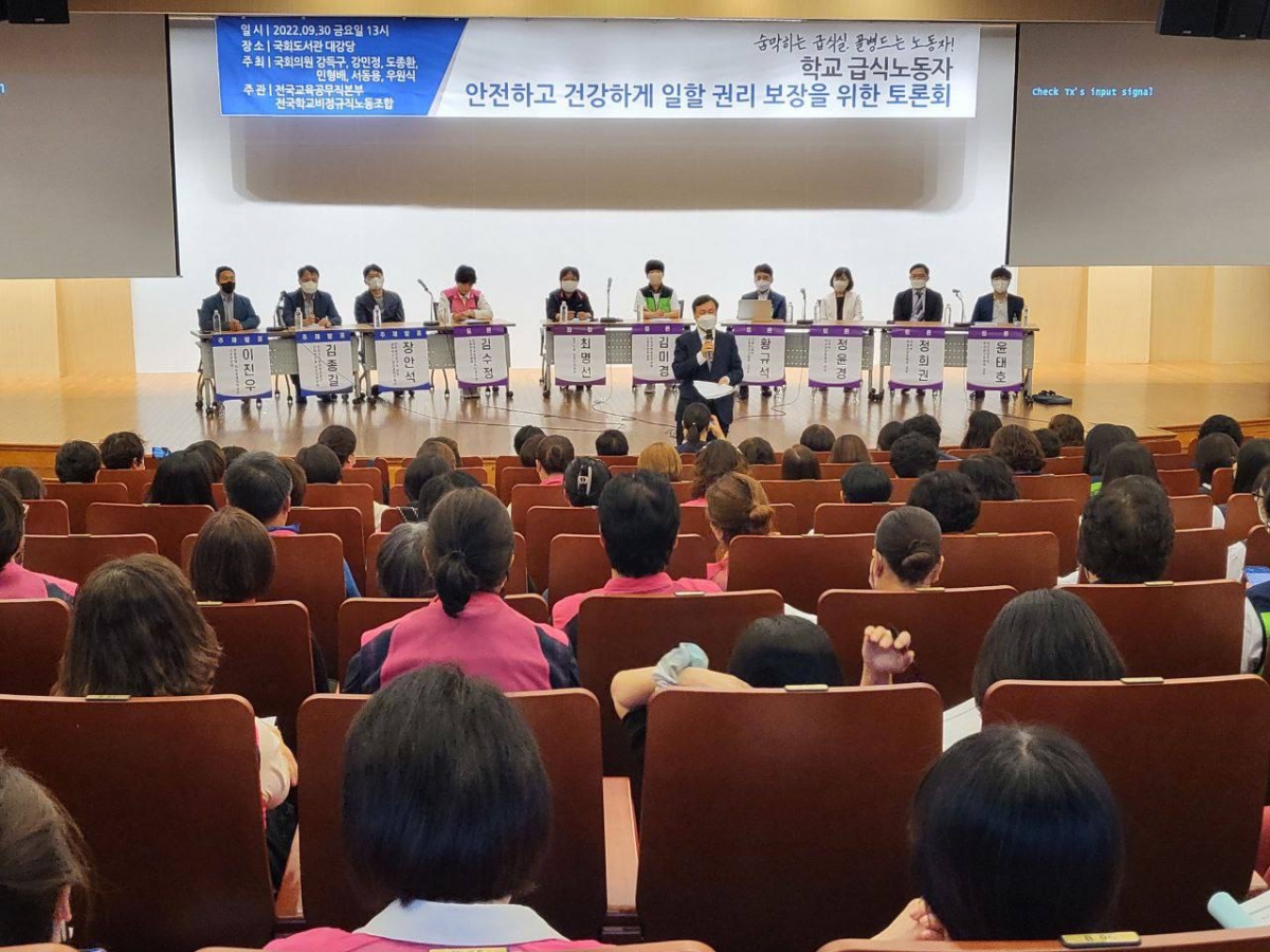 전국학교비정규직노동조합과 교육공무직본부는 강득구, 강민정, 도종환, 민형배, 서동용, 우원식 국회의원 등과 공동 주최로 어제(9.30) 국회도석관 대강당에서 ‘숨막히는 급식실, 골병드는 노동자! 학교급식노동자 안전하고 건강하게 일할 권리 보장을 위한 토론회’를 열었다. 이 날 토론회는 ▲학교급식노동자 산재현황과 대책 ▲학교급식실 환기시설 개선 대책 ▲학교급식실 인력 충원 필요성 등의 발제와 토론자로 김수정 전국학교비정규직노동조합 노동안전위원장, 김미경 전국교육공무무직본부 노동안전위원장, 정희권 교육부 학생건강정책과장, 졍윤경 교육부 학생안전총괄과장, 황규석 고용노동부 산업보건기준과 사무관, 윤태호 경기도교육청 학교급식과 과장 등이 참여해 진행되었다.