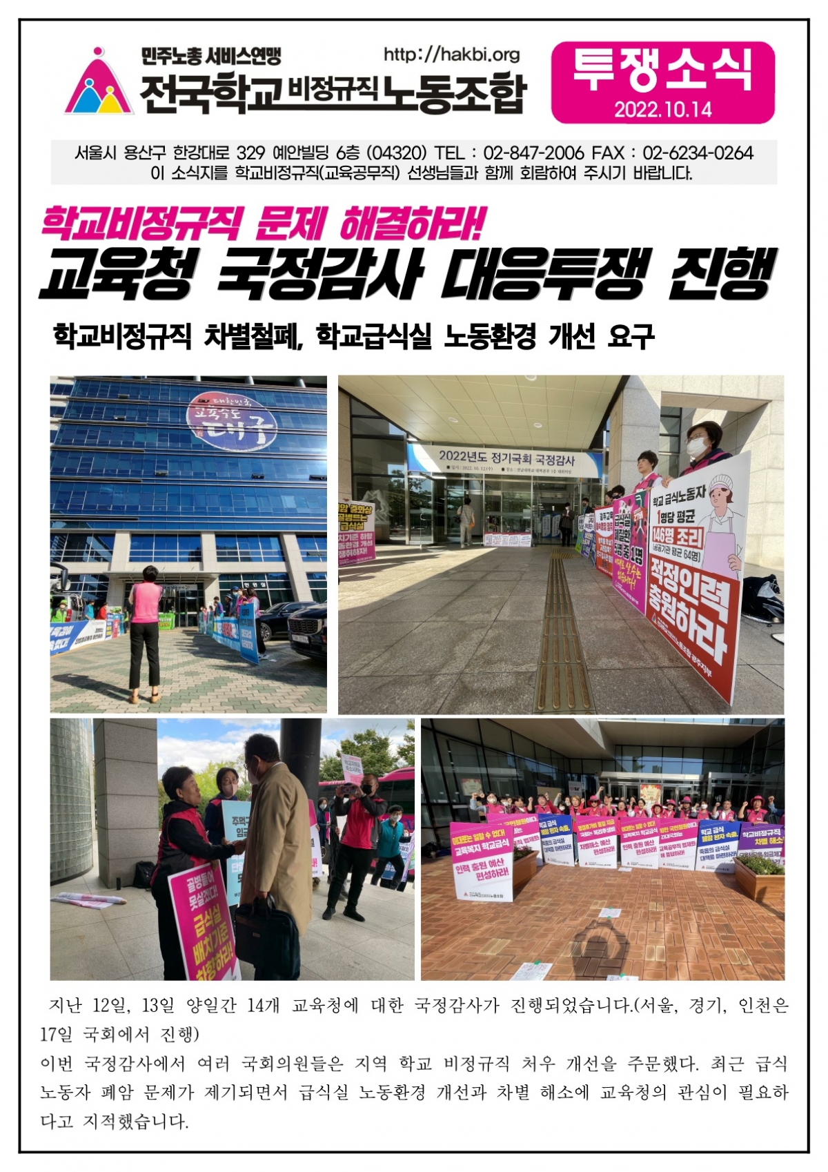 학교비정규직 문제 해결하라! 교육청 국정감사 대응투쟁 전개