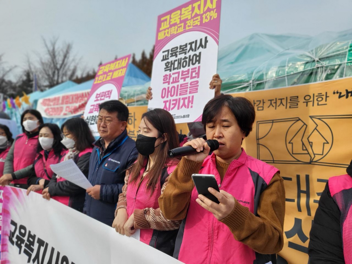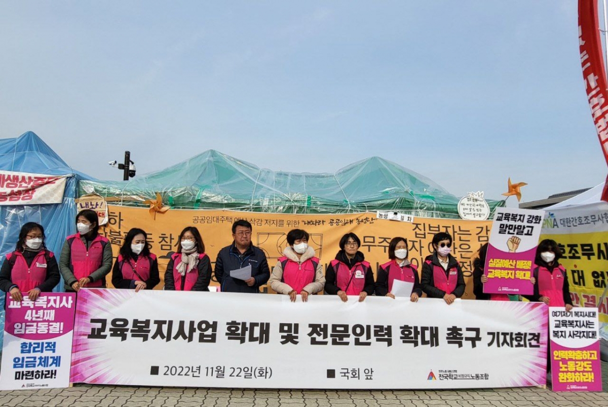 전국학교비정규직노동조합 전국교육복지사분과가 22일 국회 앞에서 교육복지 예산을 확대하고 교육복지 전문인력 충원을 촉구하는 기자회견을 진행했다.