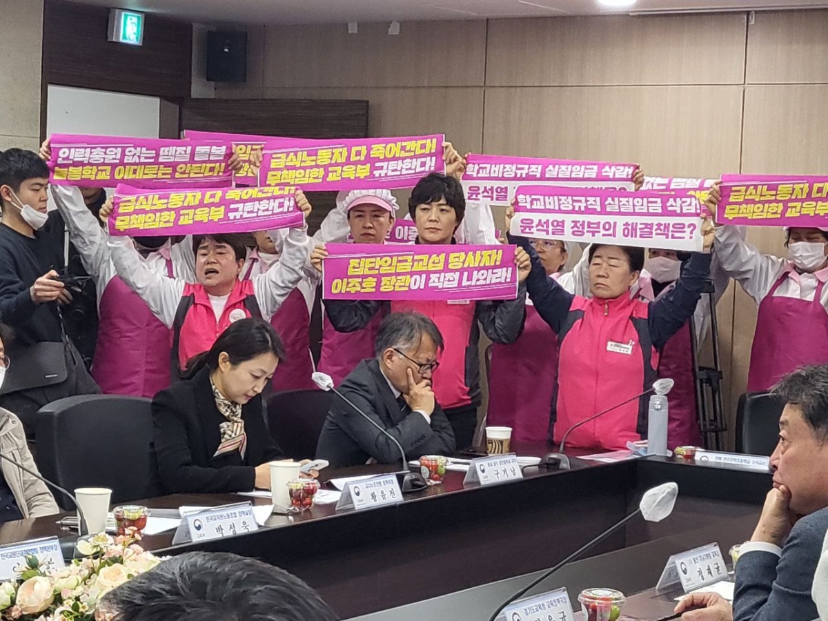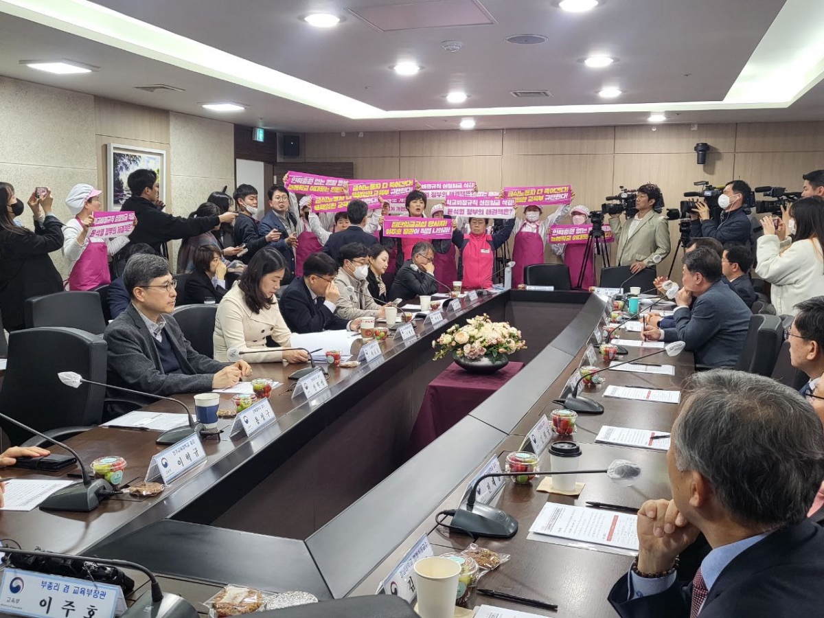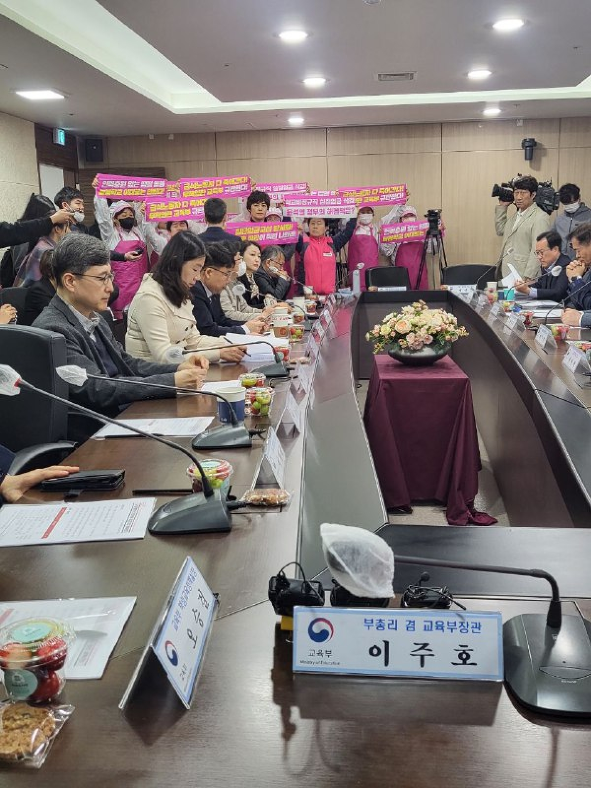 집단교섭과 학교급식실 폐암 속출 문제의 책임자인 교육부가 아무런 책임도 지지 않고, 역할을 하지 않고 있다. 이에 책임있는 교육부의 역할을 요구하며 장관이 참석하는 회의장에 들어가 장관 면담을 요구하며 투쟁을 벌였다. 이주호 교육부장관은 본인이 주재하는 회의에 나타나지 않으며 '장관없는 장관 주재 회의"를 만들어 버렸다.