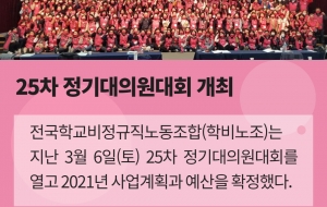 이영남 학비노조 부위원장은 “지난 19년 우리 힘으로 만든 공무직위원회를 통해 임금과 처우가 개선될 것이라는 기대가 컸다. 그런데 지금 문재인 정부가 약속한 정규직화 정책은 지금 어디로 갔는가?”며 “올해는 31조 5000억이라는 초과 세수가 걷혔다. 이런 상황에서도 기재부가 나랏돈이 제것인양 위세부리며 몽니 부리면 20만 교육공무직은 강력한 총파업에 나설 수 밖에 없다”고 단호히 말했다.