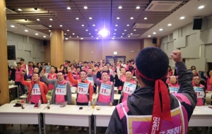 박금자 학비노조 위원장은 만연한 미소를 띄우고 결의있게 마무리 발언을 하였습니다. “다들 바쁜 주말이겠지만 지회, 분과장 간부들이기 때문에 오신 것 같다. 직접정치하는 선거운동 해야겠다는 다짐이 느껴진다. 3년 전에 학비노조 몇몇 간부님들과 평양에 간 적이 있었는데, 그때 예감했다. 정상회담이루어질 것으로. 그런데 어제 (27일)에 이루어졌다. 학비노조가 가면 길이 된다. 그만큼 학비노조는 한발 빠르다. 군축, 이미 우리가 이야기 했었다. 종북빨갱이 두렵지 않다. 이미 옳은 길을 가고 있기 때문이다. 처우개선을 넘어 세상을 바꾸는 투쟁하자 우리가 나섰다. 올해 우리가 학비노조 사업 계획대로 퍼즐이 맞춰가고 있다. 올해 가장 필요한 첫 번째 퍼즐은 <지방선거 승리! 진보교육감 17지역 석권! 22명의 학비노조후보 당선!>이다. 이것을 잘 해야 우리가 올해 고생을 덜할 것이다. (웃음)피가 되고 살이되는 오늘의 교육들을 가슴속에 잘 담고 피가 되고 살이되는 교육으로 실현하자.