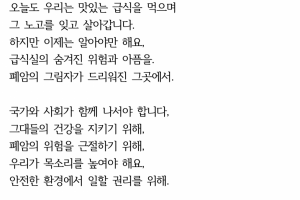 중요 [ 학교 급식실 노동자 폐암 문제 해결을 촉구하는 작품 응원 공모전 안내 ] [ 학교 급식실 노동자 폐암 문제 해결을 촉구하는 작품 응원 공모전 안내 ]   올해 7월 29일(월) ~ 8월 30일(금)까지 학교급식실 폐암대책위와 진보당 정혜경 의원, 더불어민주당 강득구, 김주영, 김태선, 문정복, 박해철 의원 공동주최로 진행한 [학교 급식 노동자 폐암 문제 해결을 촉구하는 작품 공모전]의 수상 결과가 발표되었습니다. 2021년 학교급식노동자의 폐암이 산업재해로 처음 인정된 뒤 2년 6개월 동안 113명 이상의 학교급식 노동자가 폐암 산재를 받았습니다. 환기설비 관련 점검에서 97.29%가 기준 미달이었으며, 이제 죽음의 급식실이라 불리우며 1천명 이상의 퇴사자에 인력난을 겪고 있습니다. [학교 급식 노동자 폐암 문제 해결을 촉구하는 작품 공모전]은 이러한 직업성 폐암 문제의 심각성을 알려내어 사회 변화를 촉구하기 위한 사업으로 진행되었습니다. 학교급식노동자의 폐암 근절을 위한 국가와 사회의 변화를 촉구하고, 급식노동자에 대한 연대하고자 하는 마음을 담은 시민들의 작품들이 웹포스터와 만화, 시 또는 에세이, 영상 등 다양한 형식을 통해 제출되었습니다. 응모해주신 모든 분들께 감사의 말씀을 드립니다.   이번 공모전에 응모된 총 32건의 작품 중 대상 4분, 최우수상 12분이 입상하셨습니다. 축하드립니다. 수상 여부와 상관없이 모든 분들께 다시 한번 감사드리고, 앞으로도 학교급식노동자의 산업재해 문제 해결을 위한 목소리에 많은 관심 가져주시길 부탁드립니다. 노동조합에서도 학교급식노동자의 안전한 노동환경을 위해 더 힘차게 나아가도록 하겠습니다. 감사합니다.    ○ 학교급식노동자 응원 작품 공모전 결과 대상(30만원)   초등 중등 고등 성인 태릉초등학교 정하진(그림) 방학중학교 황혜원(그림) 묵호고등학교 김용현(문학) 경상국립대학교 황서연(문학)   최우수상(10만원)   초등 중등 송정초등학교 박지은(그림) 인천아람초 홍지민(문학) 꿈키움중학교 채선우(문학) 민희주(문학) 녹천중학교 최가현(그림) 고등 성인 계산여고 주가은(그림) 마산 구암고 하다연(그림) 민하람(문학) 김호중 김도희     --------------------------------------------------------------------------------------------------------------------------------------------------------------------------------------   <심사평> ◯ 초등부 대상_ 정하진(2017년생, 태릉초) - 작품설명 : 급식노동자에 대한 뉴스 영상을 보고, 바꿔야 할 노동환경과 요구 사항을 생각하고, 행복한 급식노동자의 모습을 상상하며 그린 작품   - 선정 이유 : 어린이다운 귀여운 표현과 상상력으로 급식노동자 폐암 산재 재발방지를 위한 해결책을 구체적으로 제시한 점이 참신함. 아마도 어린이가 상상할 수 있는 가장 큰 금액일 “‘1억’ 같은 큰 투자”라는 구호는 직관적으로 사회적으로 충분한 투자를 해야 폐암산재 문제를 해결할 수 있다는 공감을 일으킴. ◯ 초등부 최우수상_ 박지은(2013년생, 이천송정초) - 작품설명 : 일하시느라 힘든 급식노동자분을 한 학생이 발견하고 그 학생의 관심으로 힘을 받는다는 내용입니다. - 선정 이유 : 심플한 그림체에 깊이 있는 표현이 돋보임. 급식을 먹는 학생 등 많은 사람의 관심과 연대는 까맣게 병든 학교급식노동자의 가슴을 건강하게 회복시키는 힘으로 작동할 것이라는 기대감을 불러일으키는 작품. ◯ 초등부 최우수상_ 홍지민(2014년생, 인천아람초) - 작품설명 : 더운 날씨에도 저희를 위해 고생하시는 아주머니께 급식을 먹으면서 항상 감사함을 느낀다고 전하고 싶었습니다.   - 선정 이유 : 매일 밥, 국, 반찬을 만들어 제공해주시는 급식노동자에 대한 감사한 마음이 잘 느껴지는 작품. 알록달록하게 채색한 시화로 작품의 매력이 한층 더해 짐. ◯ 중등부 대상_ 황혜원(2009년생, 방학중) - 작품설명 : 저희의 두 번째 어머니처럼 매번 미소를 보여주시던 급식 선생님들의 아픔을 그렸습니다. 저에게 좋은 말만 해주시고 미소를 보여주시던 급식 선생님들이 학생들의 급식을 만들어 주시면서 병을 갖게 되신 것이 마음이 아파 제가 급식 선생님들 덕에 기쁜 마음처럼 그분들도 부디 좋은 환경에서 건강하시게 일하시길 바라며 그리게 되었습니다.   - 선정 이유 : ‘포스터’라는 형식에 딱 알맞고, 완성도 있는 표현으로 돋보이는 작품. 조리흄이라는 학교급식실 폐암의 원인, 몸이 부서져라 고되게 일해야 하지만 그래도 어린 학생들을 대할 때는 미소를 지어 보이는 학교 급식노동자의 녹록치 않은 모습, 그리고 ‘미소 뒤에 아픔이 있는지 그때는 몰랐습니다’라고 함축적으로 표현된 연대와 공감의 구호가 한 장의 그림 안에 모두 잘 들어가 있음. ◯ 중등부 최우수상_ 채선우(2009년생, 경남꿈키움중) - 작품설명 : 작품은 급식 노동자의 시점에서 전개됩니다, 단순 경제활동을 넘어 더운 급실식에서 몇시간식 강도 높은 노동을 하는 장면들을 묘사합니다. “점점 구워지는”이 문단 부터는 비유적으로 급식노동자들이 힘들다는 것을 표현 하였습니다, 작품의 의미는 급식노동자들의 힘듬과 처우를 개선하자는 의미를담아 비유법,묘사등