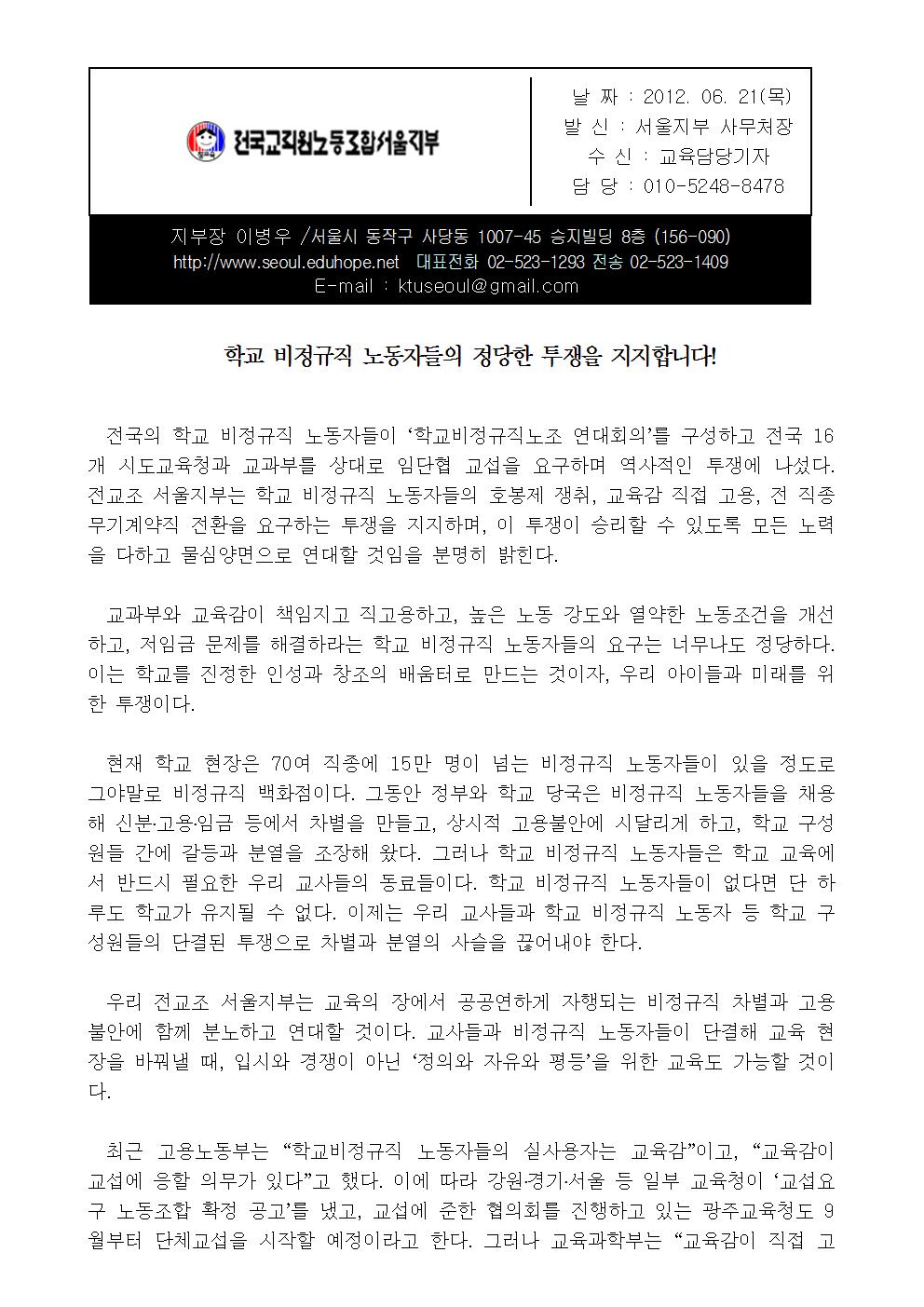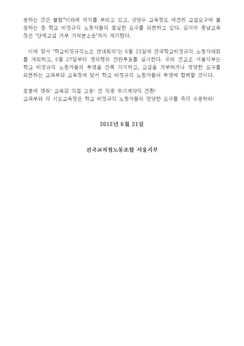 전교조의 전국학교비정규직노동자 투쟁 지지 성명서입니다.^^