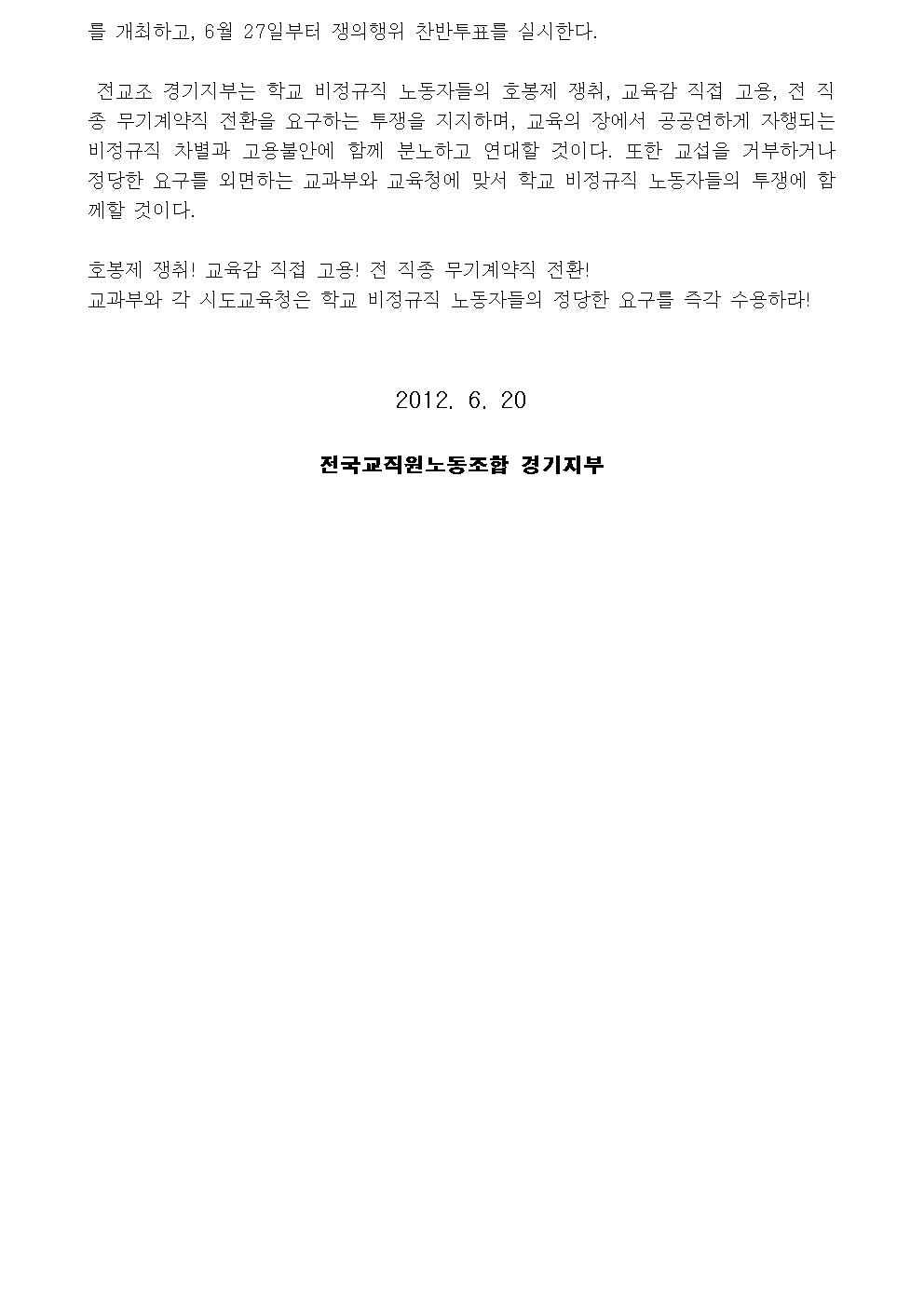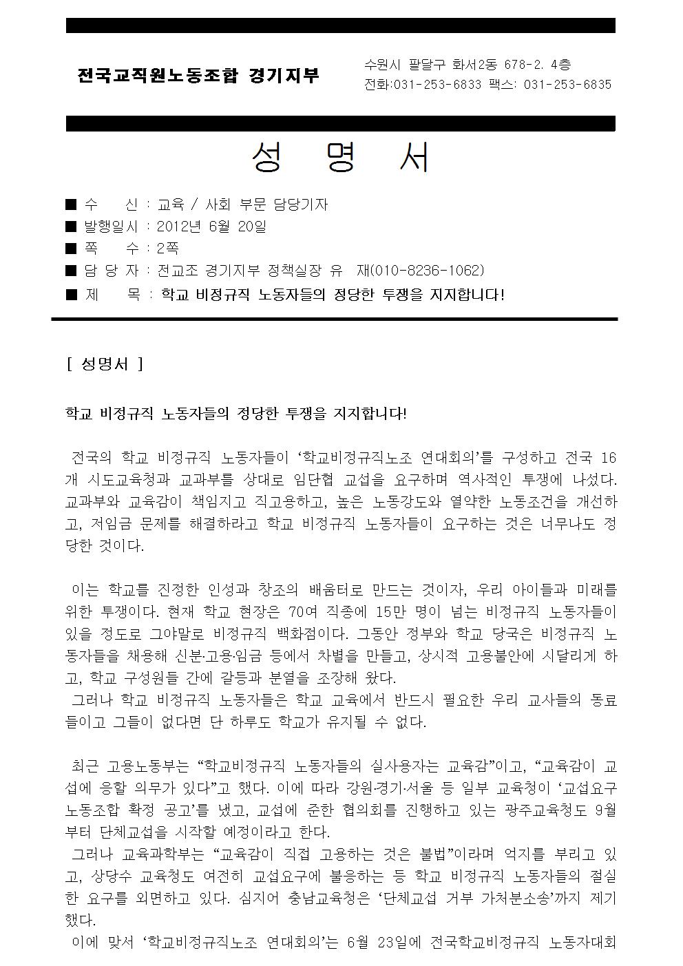 전교조의 전국학교비정규직노동자 투쟁 지지 성명서