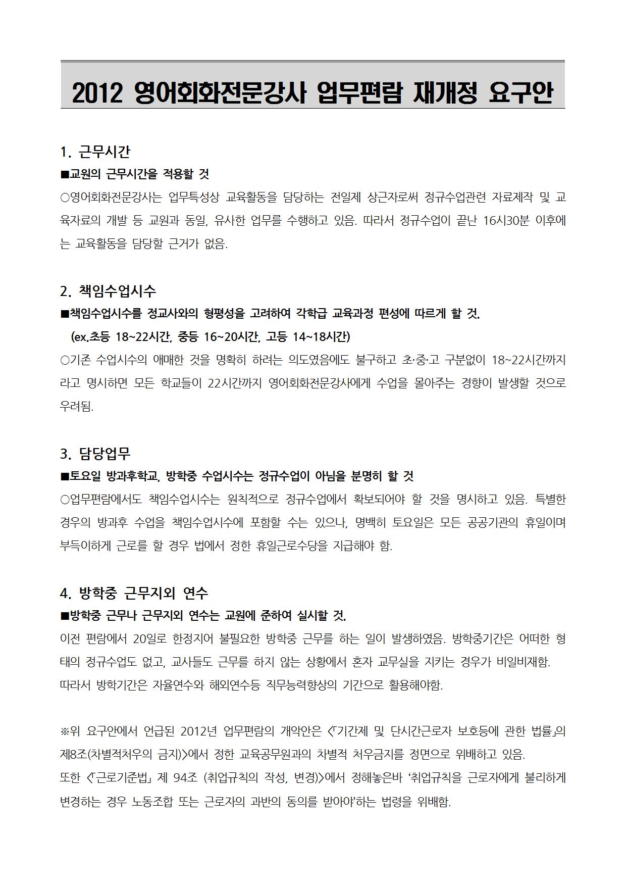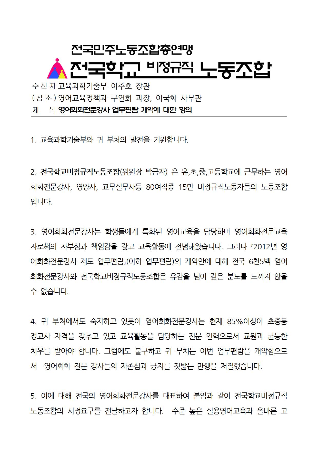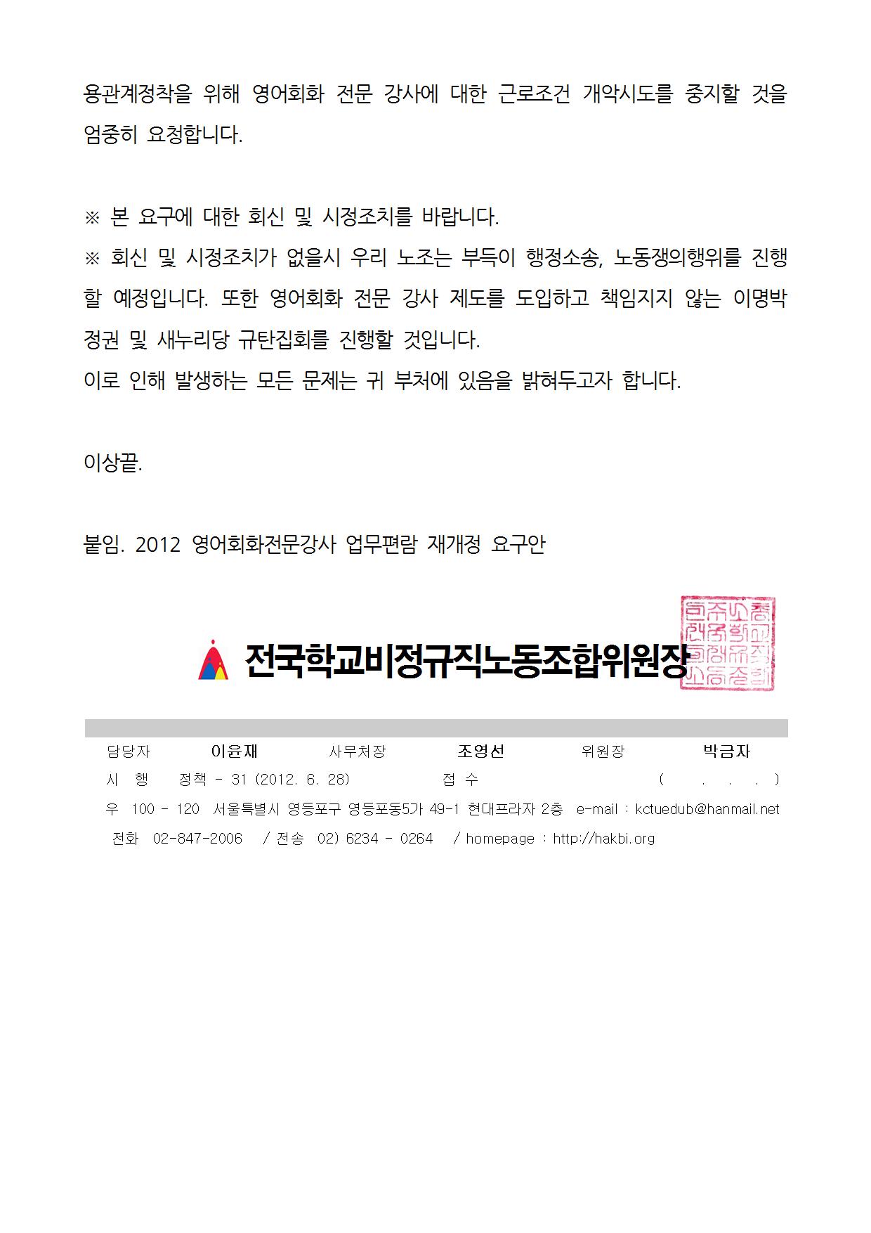 2012년 영어회화전문강사 업무편람 개악시도 교과부항의 공문접수