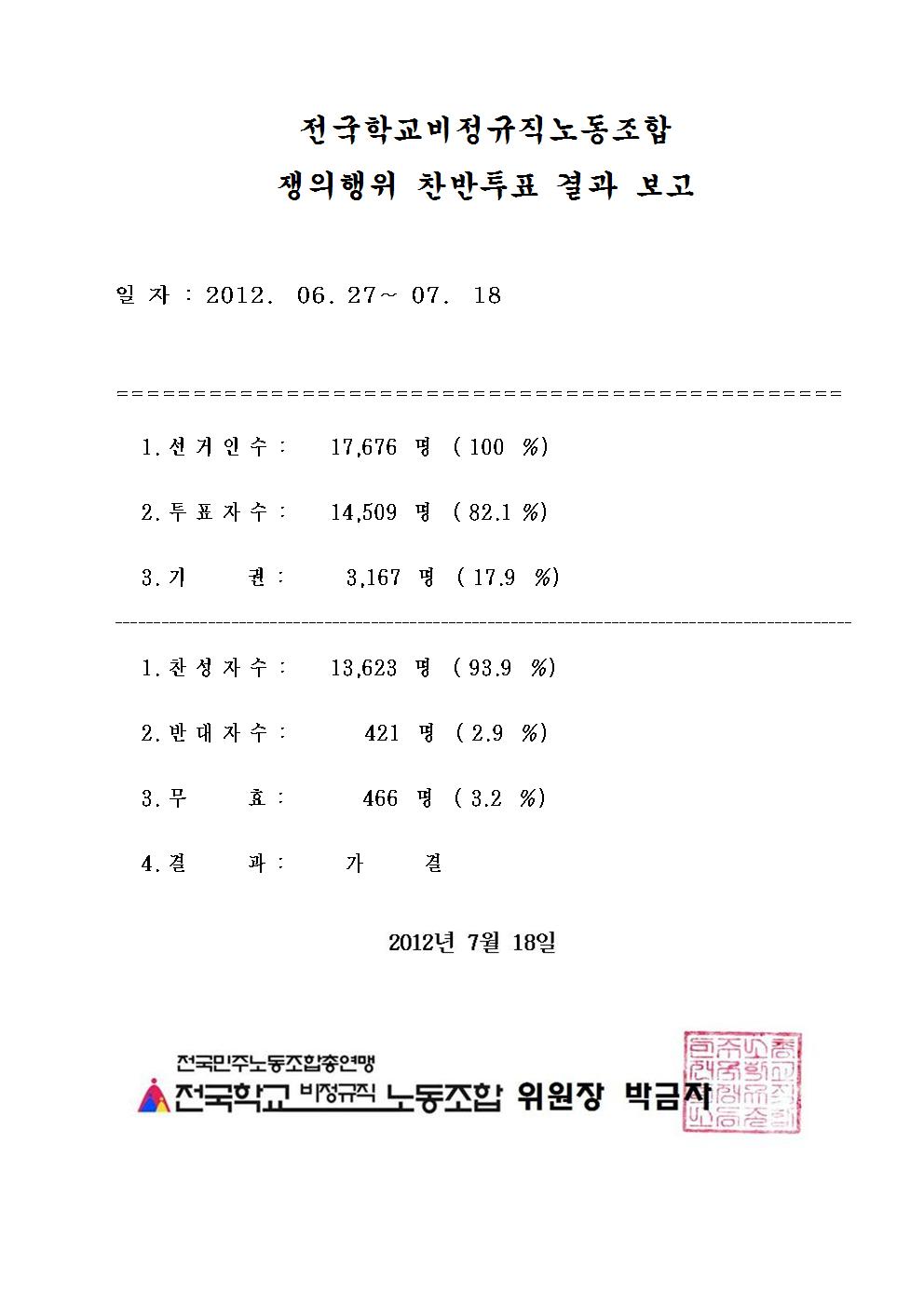 2012 단체교섭 승리를 위한 쟁의행위 찬반투표 조합원 총회에 대한 결과 공고입니다.
