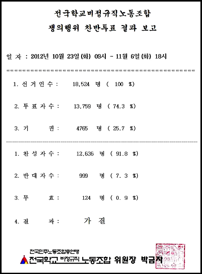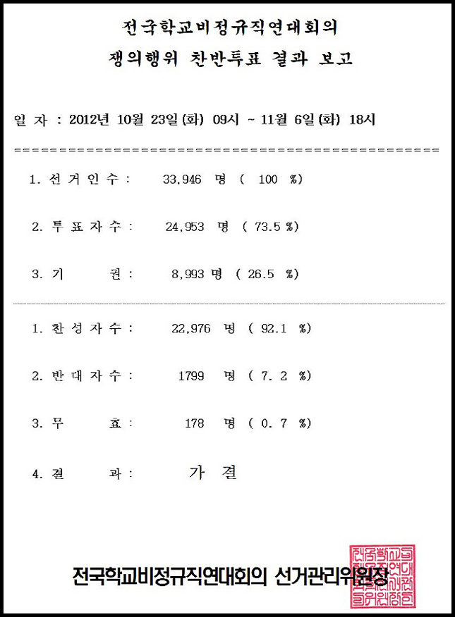 2012 총파업에 대한 쟁의찬반 투표 결과를 공고합니다. 전지역에서 압도적 찬성으로 합법적 쟁의권을 확보하였습니다.2012 임단협 승리, 호봉제 쟁취, 교육공무직법안 입법 발의를 위한 학비노동자들의 투쟁은 이제부터 시작입니다.