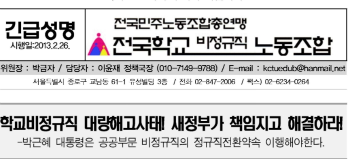 박근혜 새정부가 첫배를 띄운 2월 25일, 교육과학기술부(이하 교과부)가 실시한 〈학교비정규직 계약해지실태 조사>결과 총 6,475명이 계약해지(13.2.15 기준)된 것으로 나타났다.
