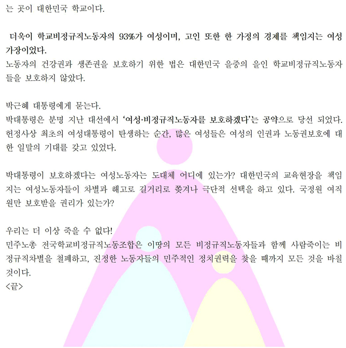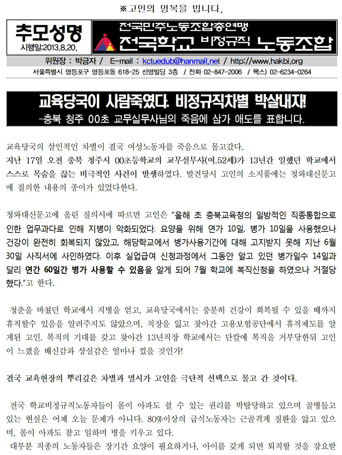[0820긴급 추모성명] 교육당국이 사람죽였다. 비정규직차별 박살내자!