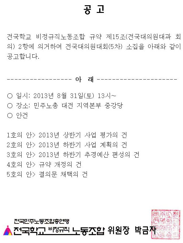 ▶◀ 5차 임시대의원대회 소집 공고