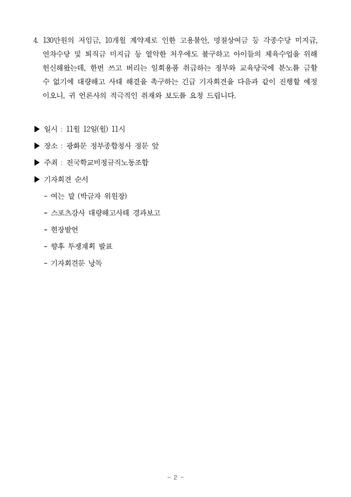 전국학비노조 스포츠강사분과 준비위원회는 11월 12일(화) 오전11시 교육부 앞에서