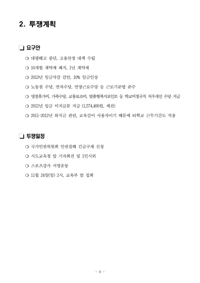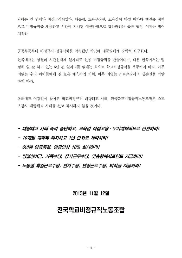 더불어 스포츠강사 대량해고 중단! 10개월 계약제 폐지! 처우개선! 을 요구하는