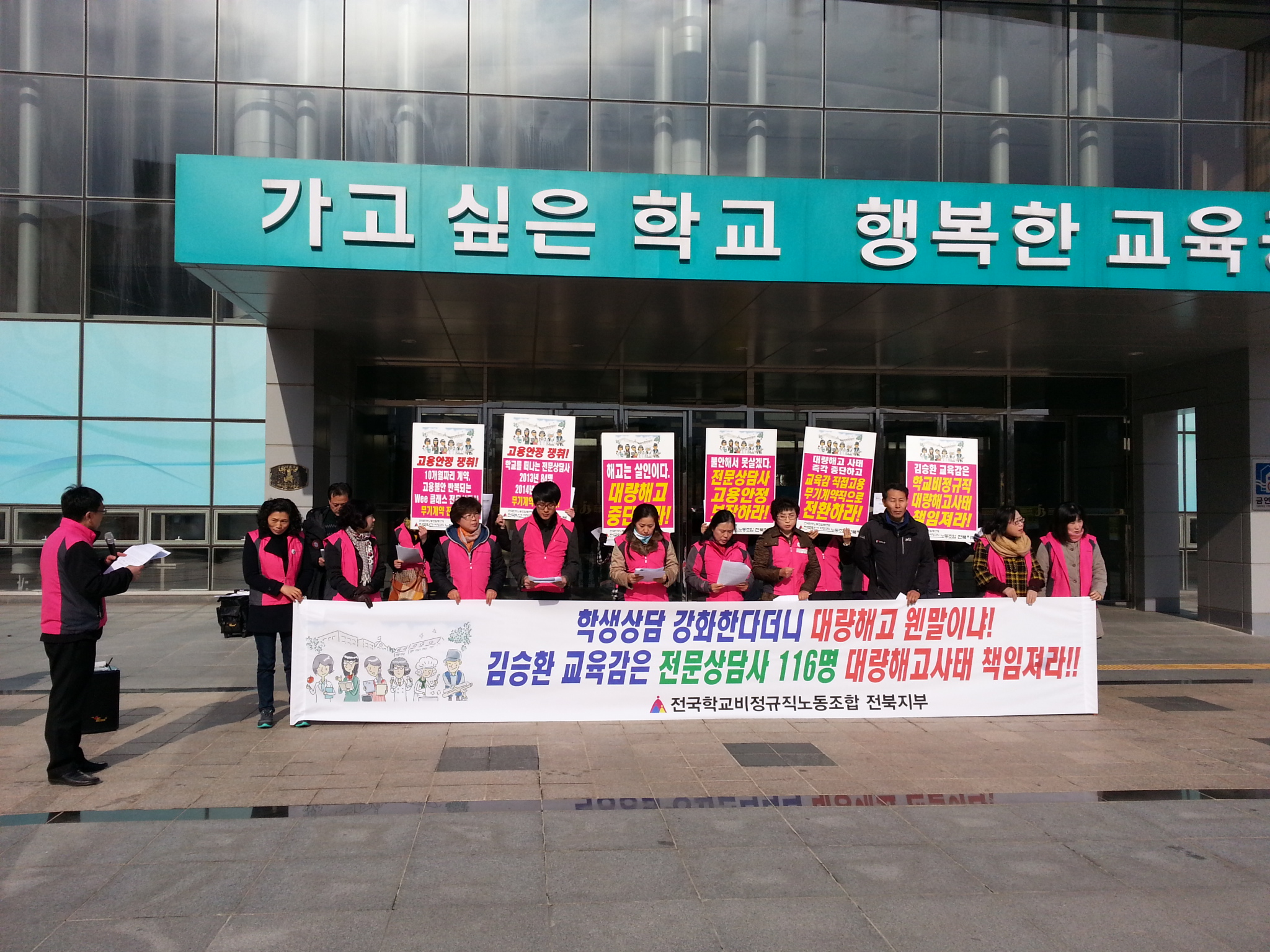 우리는 오늘 비참한 심정으로 이 자리에 섰다. 전라북도교육청(이하 전북교육청)이 내년 학교비정규직 정원계획에 116명에 이르는 전문상담사의 정원을 한명도 배정하지 않았다한다. 올해 12월로 계약이 종료되는 116명의 전문상담사들은 내년에 갈 곳이 없어질수도 없는 위기에 놓인 것이다.