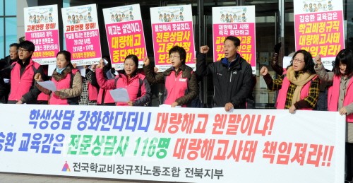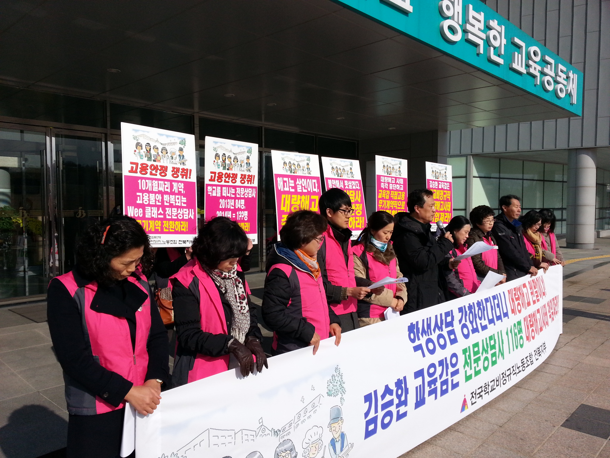 우리가 더욱 분노가 치밀어 오르는 것은 전북교육청의 이중적인 태도이다. 학교비정규직의 고용계획을 수립하는 행정과장이‘비정규직 양산을 억제하기 위해, 전문상담사를 해고할 수밖에 없다’는 망언을 서슴치 않았다고 한다.‘비정규직 없는 학교를 만들겠다’는 것이 비정규직을 모두 학교에서 내쫓는 방식이란 말인가! 김승환 교육감은 이러한 상황을 알고는 있는 것인가!