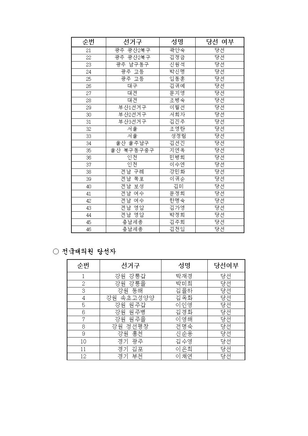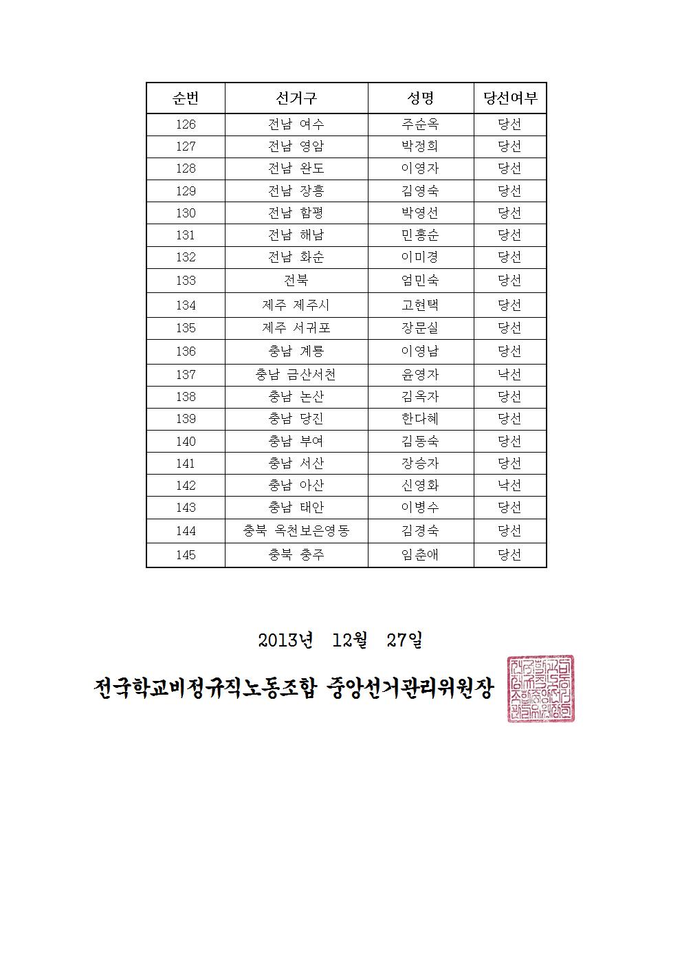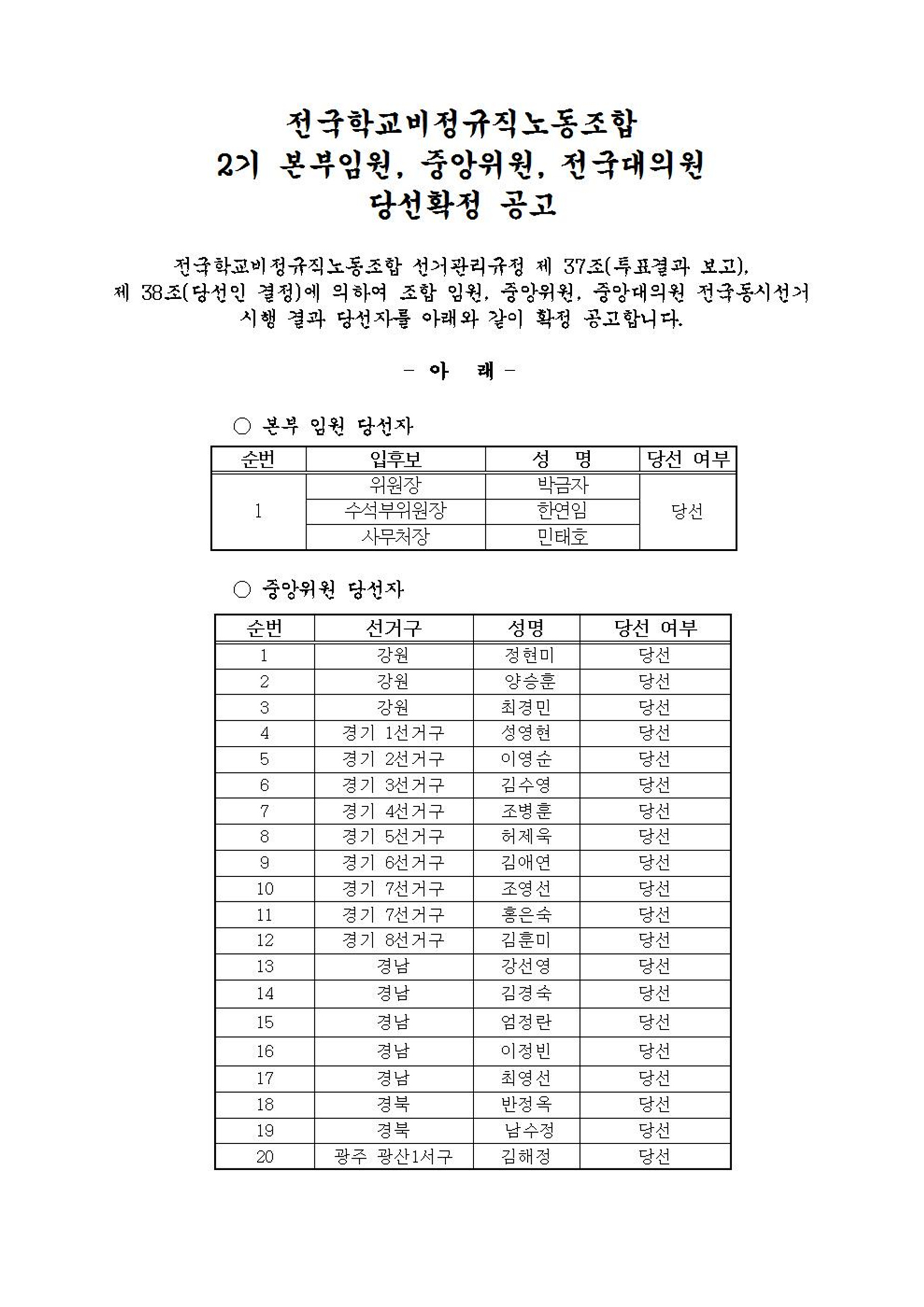 2기 전국동시 선거 조합임원, 중앙위원, 전국대의원 당선 공고