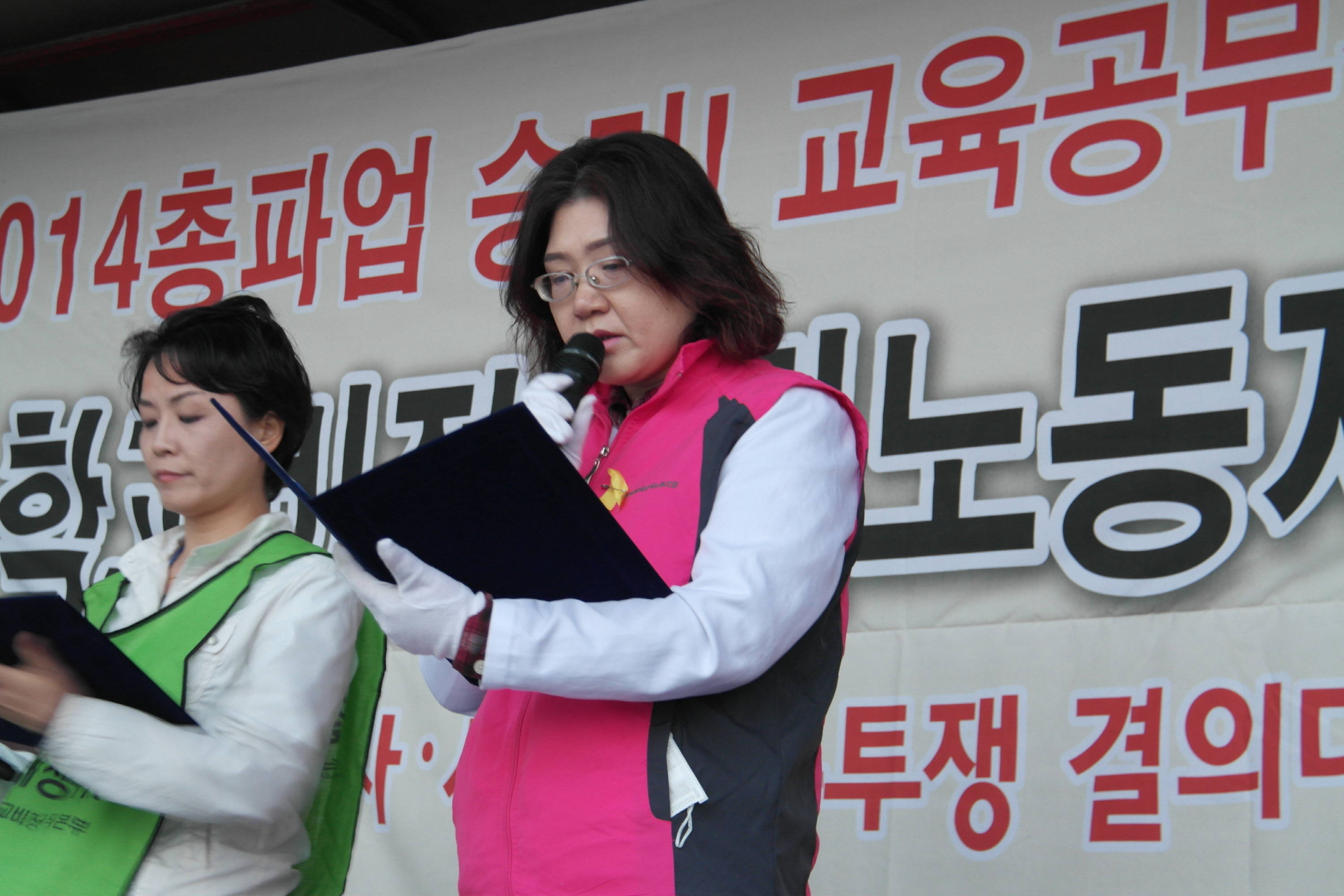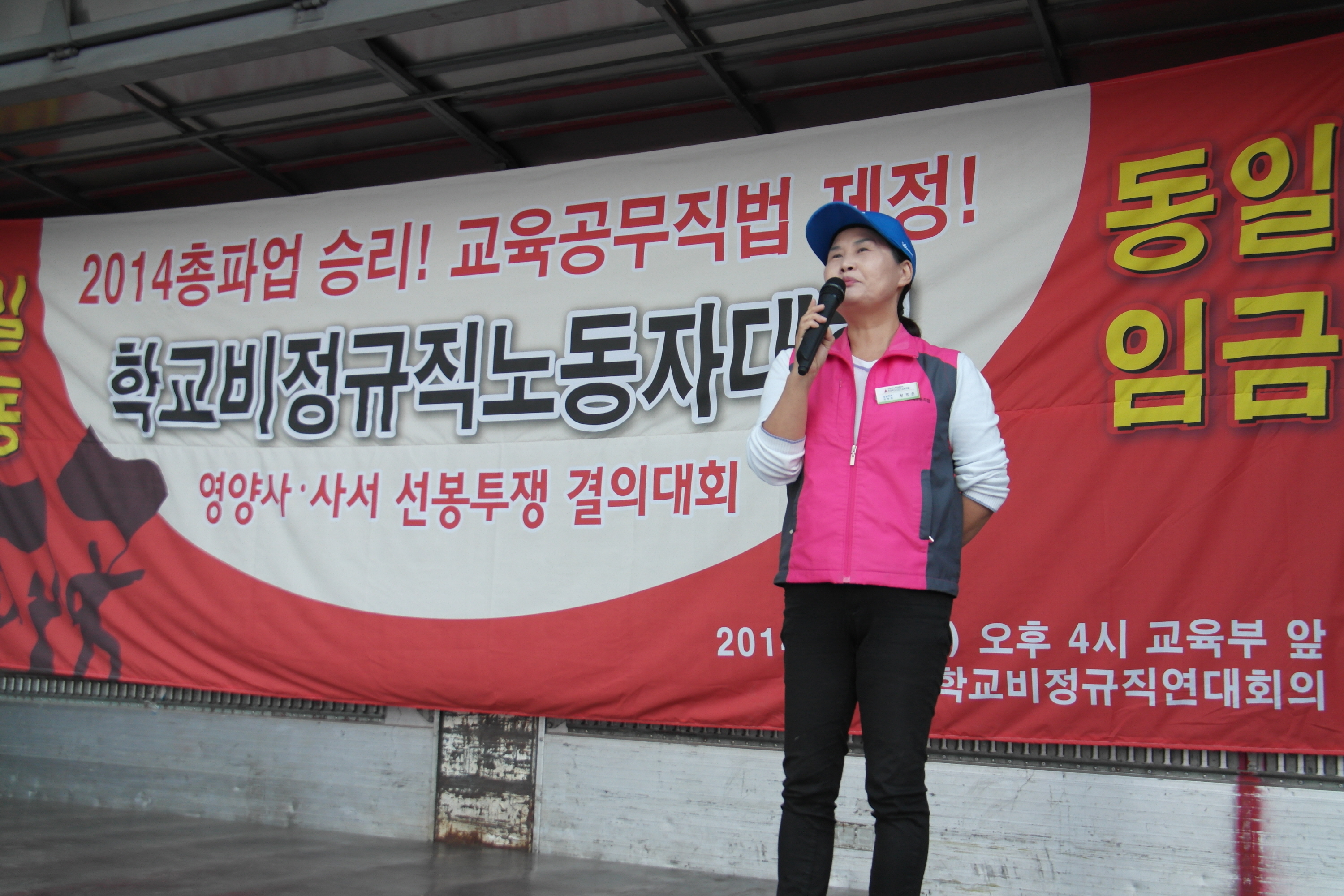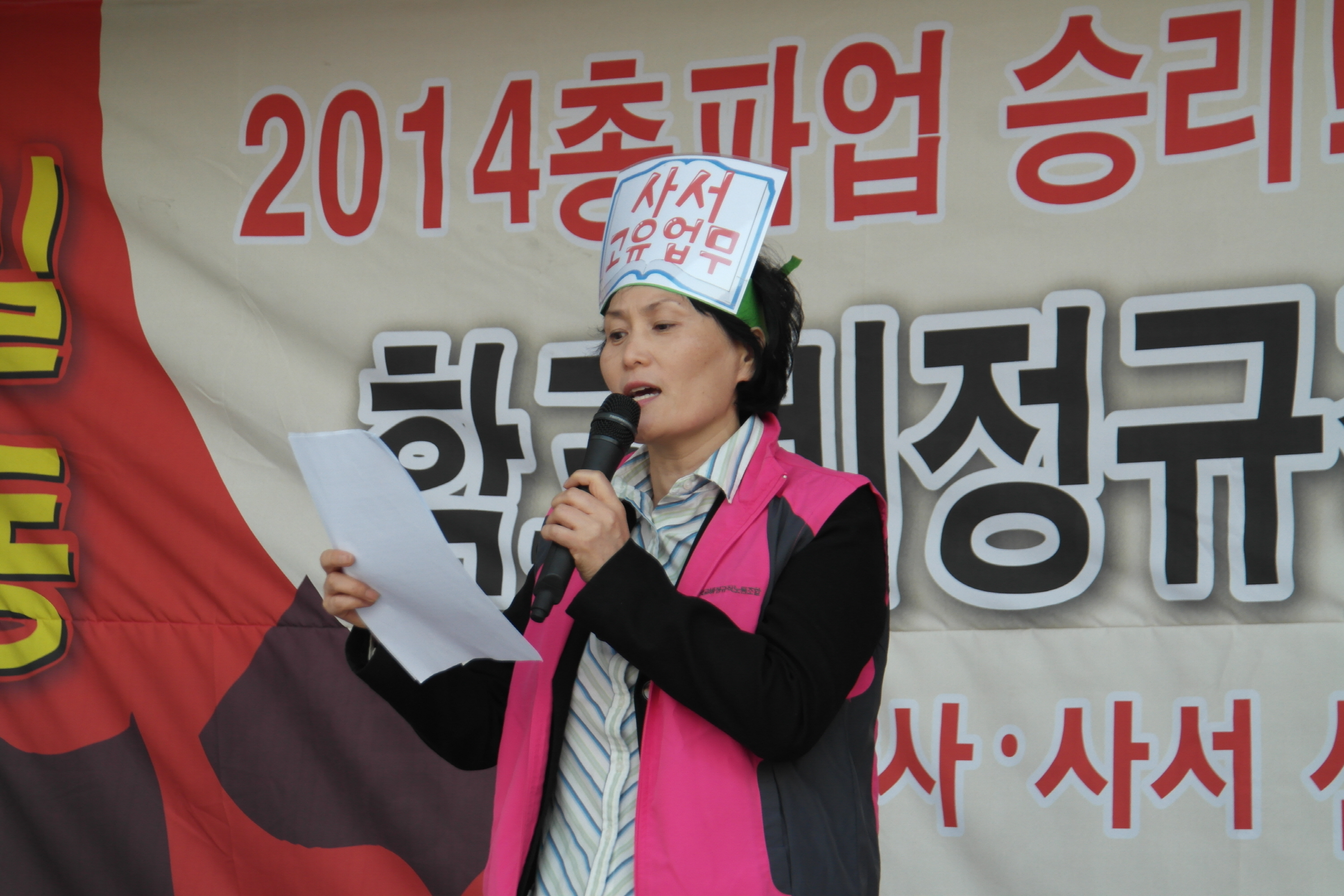 우리는 11월20일,21일 전국학교를 멈출 계획을 하고 있다. 교육부와 교육당국은 오늘 이 자리에 모인 영양사, 사서의 선봉투쟁을 통해 분명히 깨닫기 바란다. 호봉제 쟁취, 급식비, 명절상여금등 5대 요구안 쟁취를 위한 우리의 총파업 투쟁은 교육부가 답을 내놓을 때까지 계속 될 것이다.