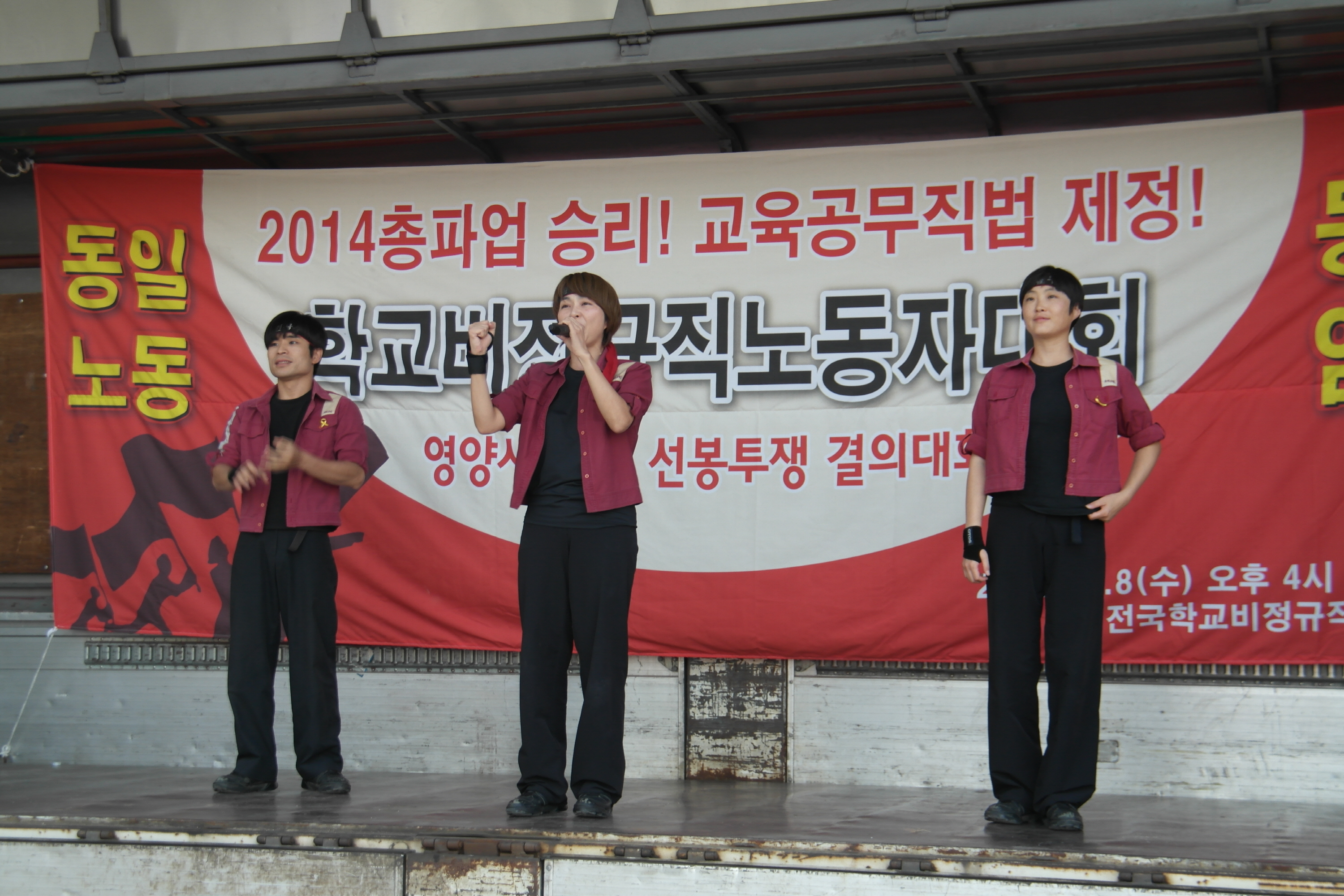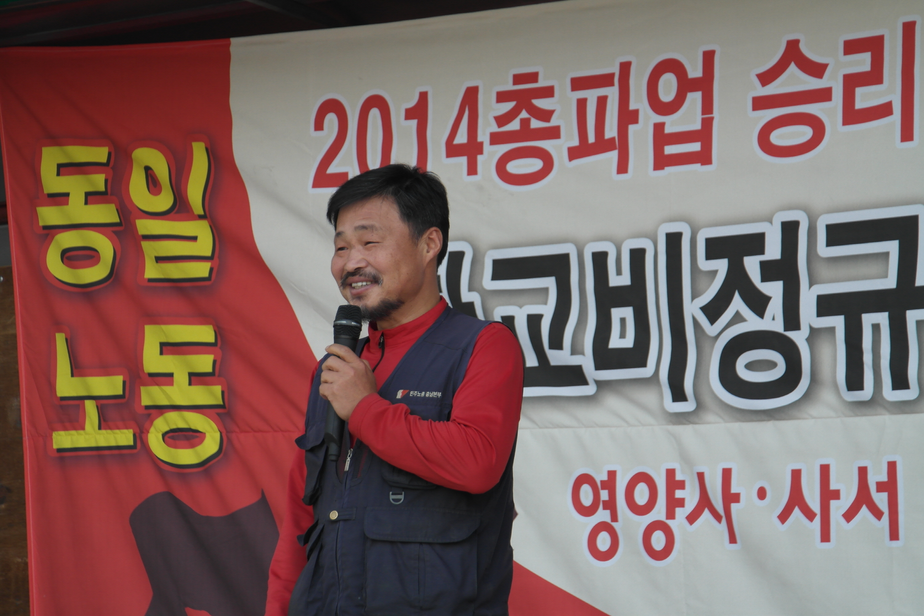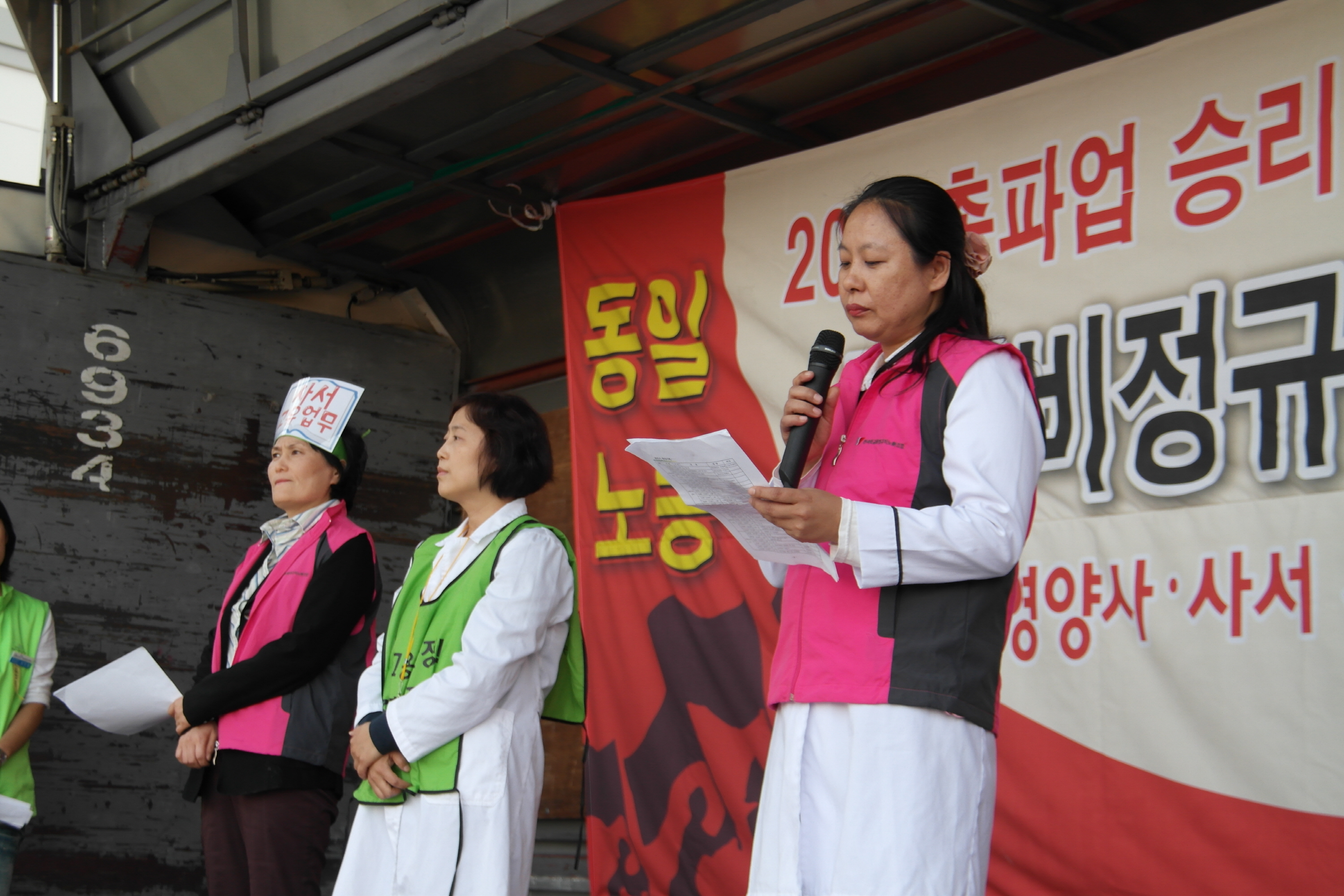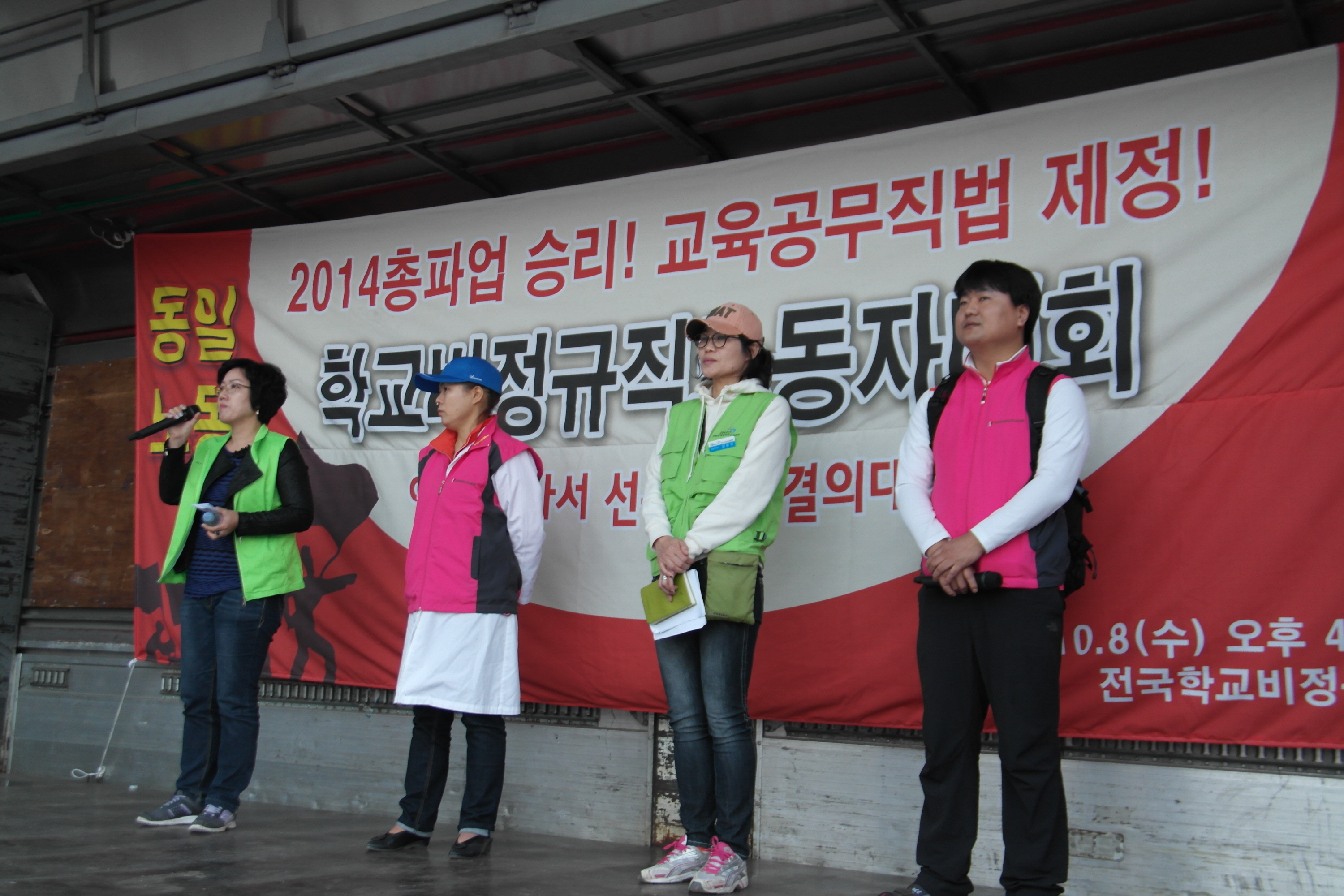 우리는 11월20일,21일 전국학교를 멈출 계획을 하고 있다. 교육부와 교육당국은 오늘 이 자리에 모인 영양사, 사서의 선봉투쟁을 통해 분명히 깨닫기 바란다. 호봉제 쟁취, 급식비, 명절상여금등 5대 요구안 쟁취를 위한 우리의 총파업 투쟁은 교육부가 답을 내놓을 때까지 계속 될 것이다.