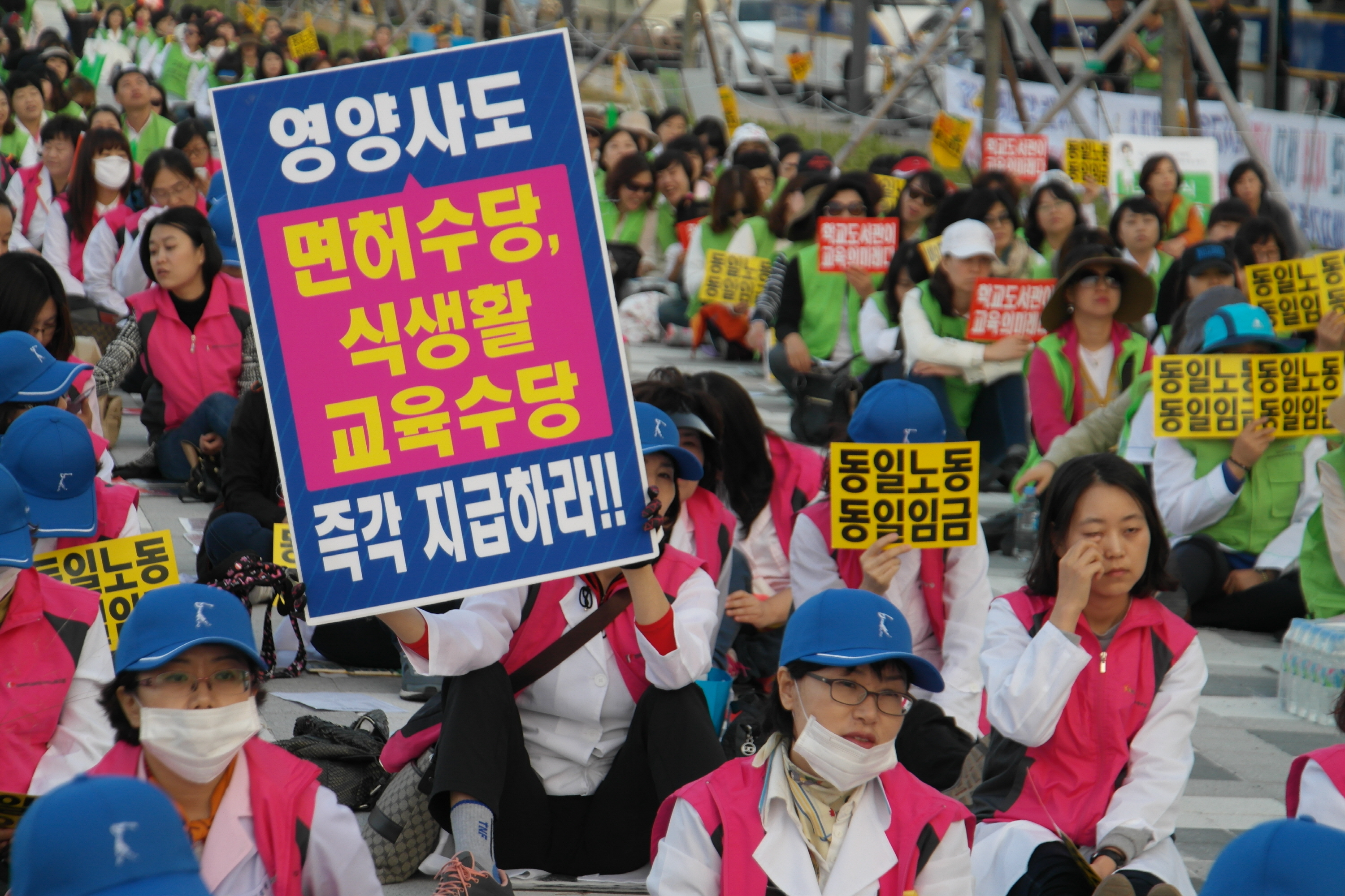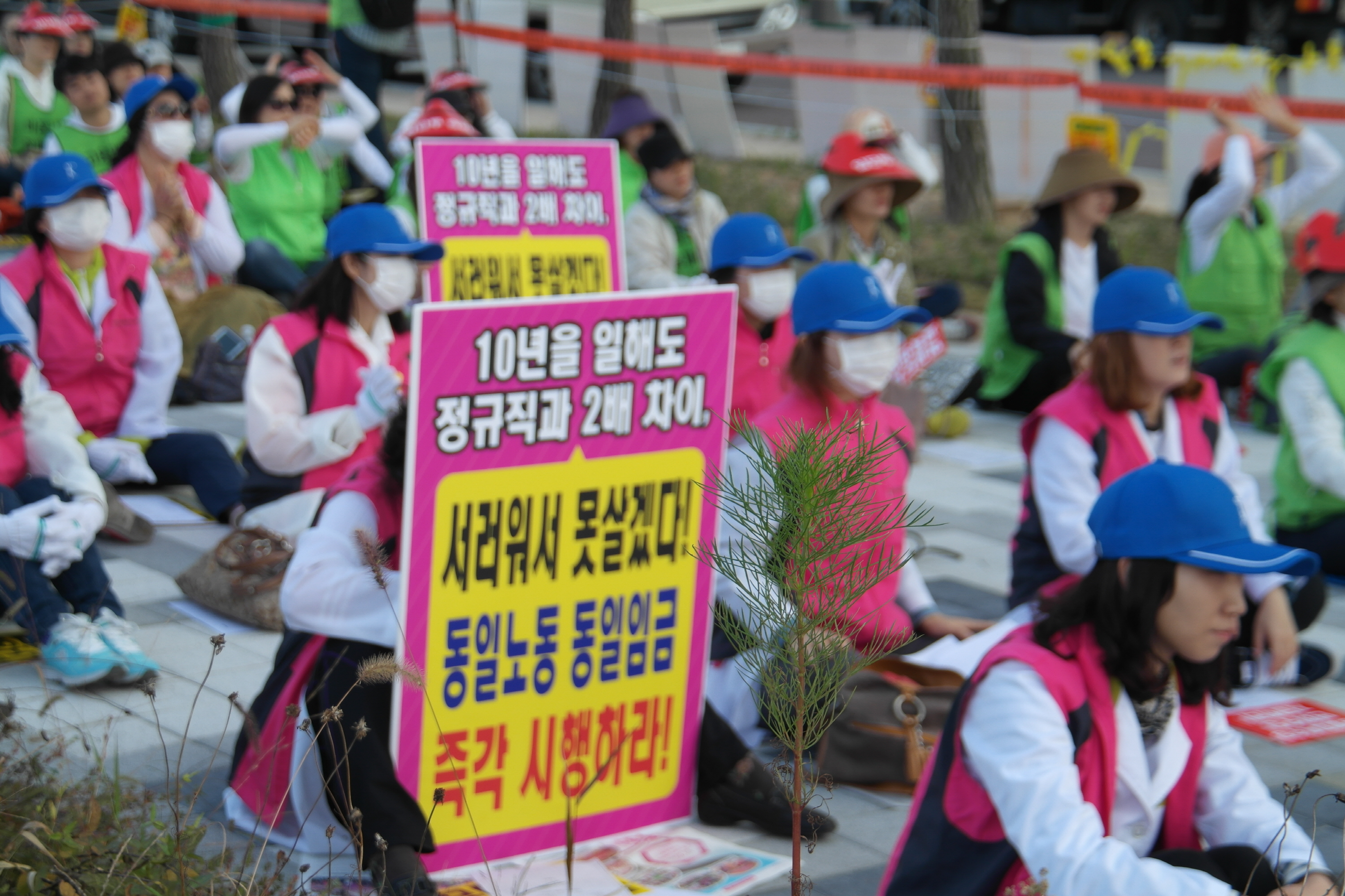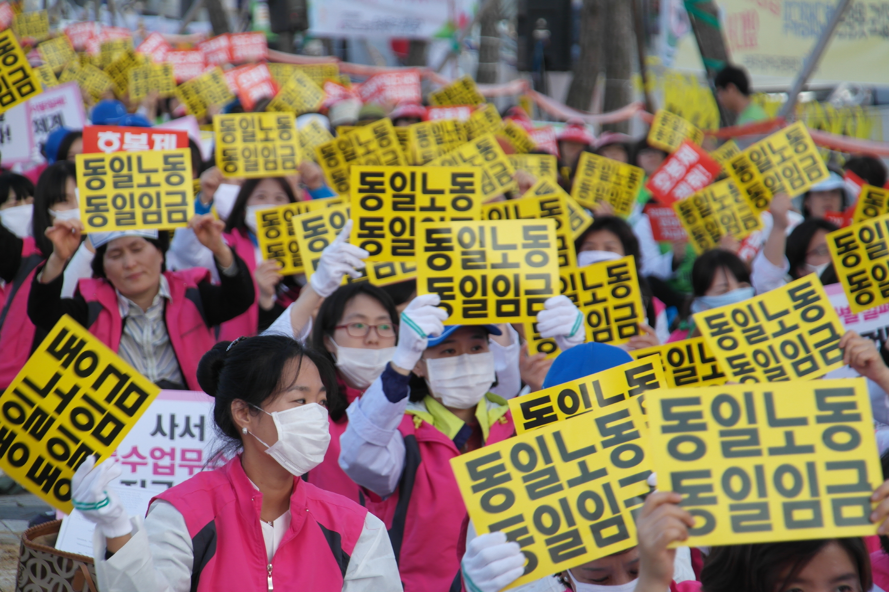 동일노동 동일임금 쟁취하자! 동일노동에는 동일한 임금을 지급해야 한다.