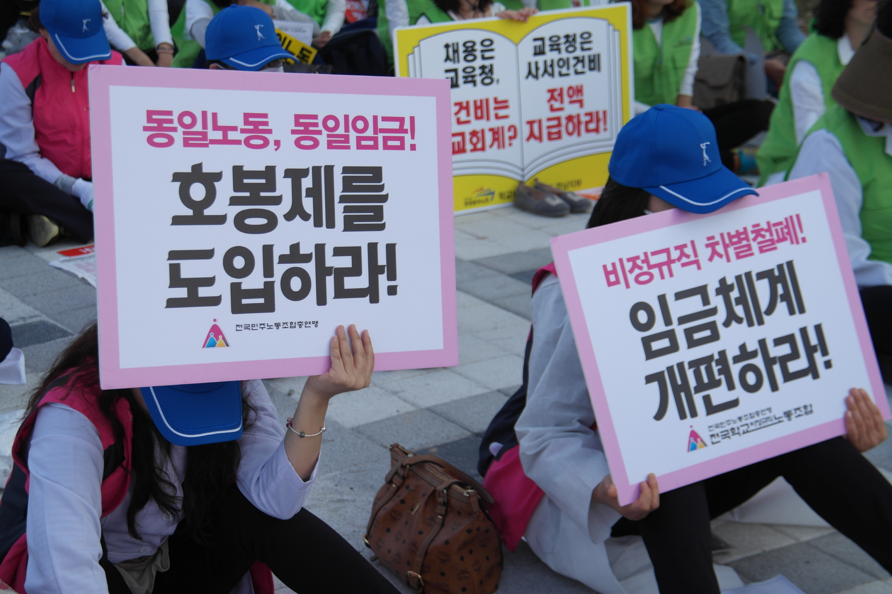❍ 동일노동, 동일임금 지급하라! | | ❍ 비정규직 차별철폐! 호봉제를 도입하라! ❍ 모든 학교도서관 사서를 배치하라! ❍ 사서인건비 교육청이 전액 지급하라! |