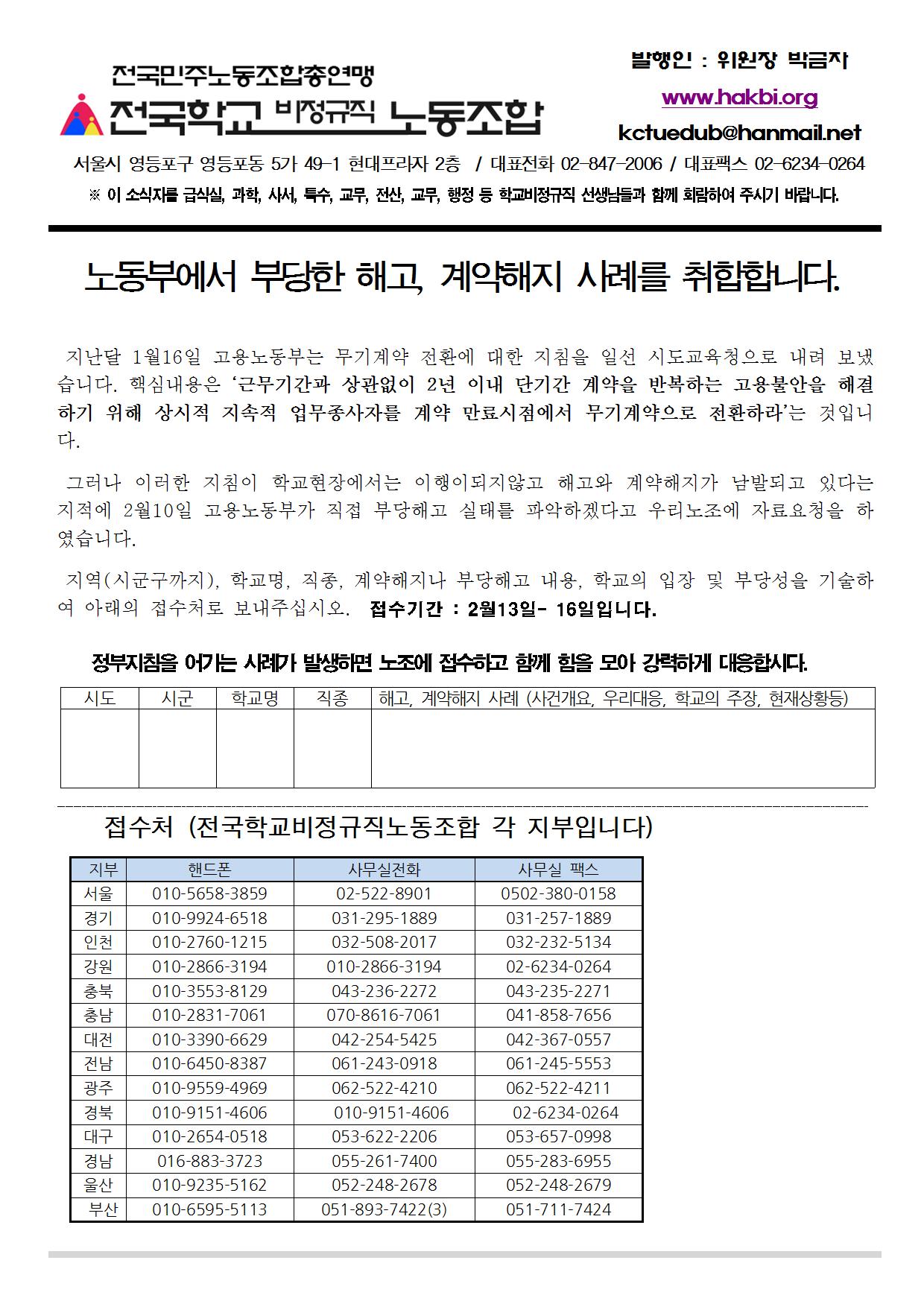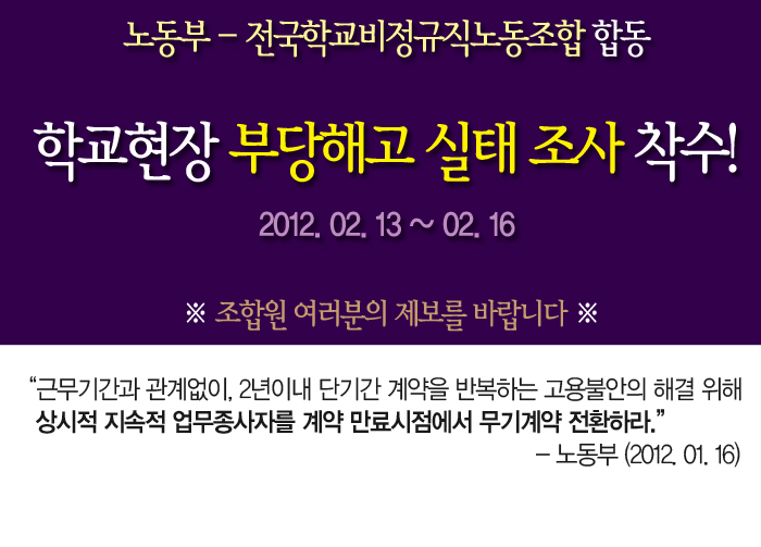 노동부 – 전국학교비정규직노동조합 합동 ‘학교현장 부당해고 실태조사’ 착수